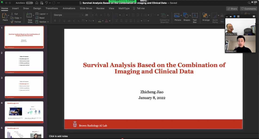 2022年1月8日上午10时,布朗大学焦志成博士应邀与我院师生开展线上学术交流,并就“基于成像及诊疗数据的预后分析“进行学术报告。学院研究生与教师总计30余人参加。焦志成博士的告引起师生们的热烈反响与好评。