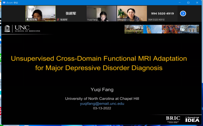 2022年3月13日(星期日)上午九点,受色播 智能数据分析团队邀请,北卡罗来纳大学教堂山分校房钰棋博士后在线上做了关于Unsupervised Cross-Domain Functional MRI Adaptation for Major Depressive Disorder Diagnosis 的学术报告,除智能数据分析团队的全部教师和研究生参加以外,本次会议也邀请了其他高校的老师和学生参加,在会议中师生们进行了精彩的发言讨论。