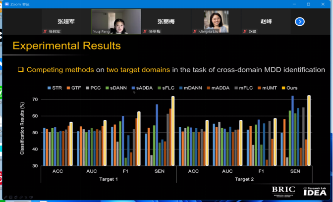 在本次会议中,房钰棋博士后首先介绍了她目前相关的工作内容,会议的主要内容介绍了静息态功能磁共振成像(rs-fMRI)数据的广泛应用,如脑功能障碍的自动化诊断,如重度抑郁症(MDD),可以用来协助干预。其中多部位fMRI数据被越来越多地用于增加样本量和提高MDD调查的统计能力。然而,现有的研究通常存在显著的站点间异质性,例如扫描仪和/或扫描协议的差异。为了解决这个问题,房钰棋博士引入了两个用于自动MDD识别的无监督跨域fMRI适应模型。