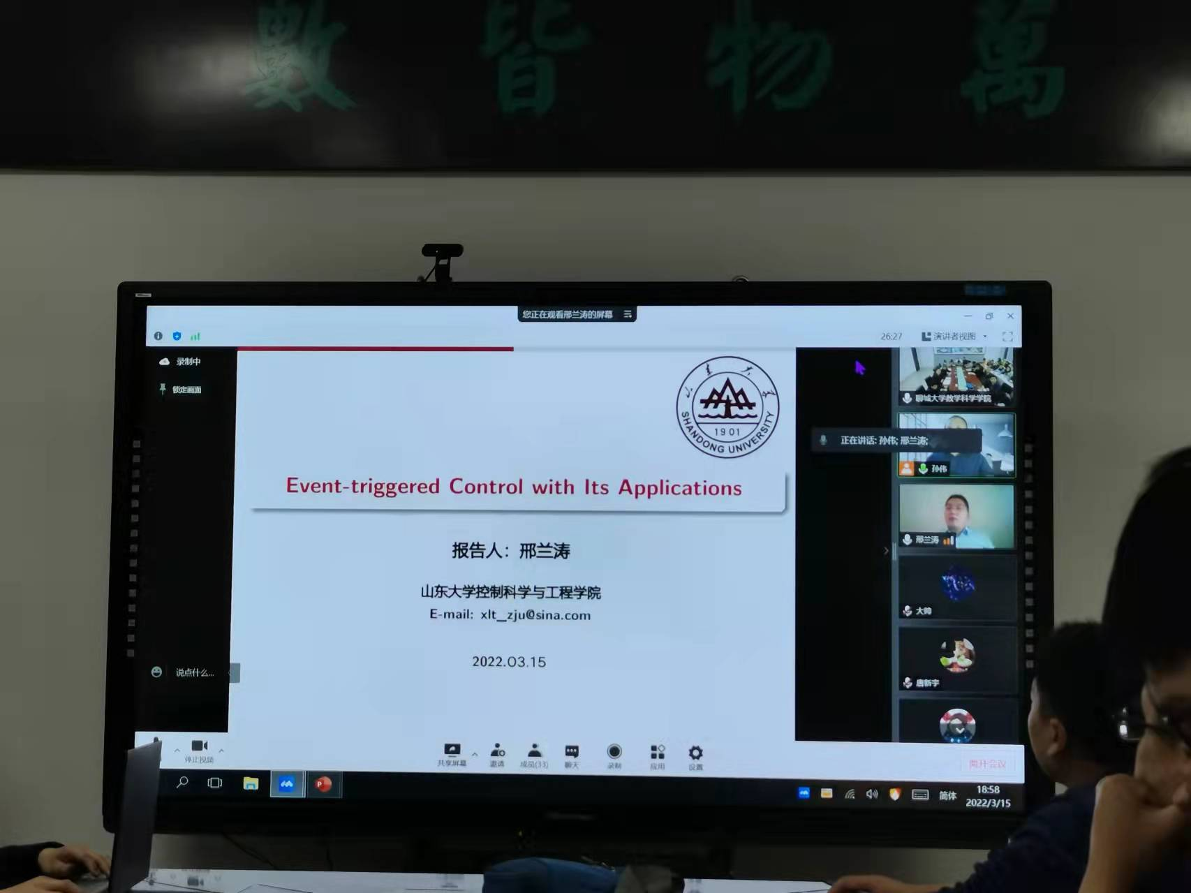 2022年3月15日(星期二)晚上七点,山东大学邢兰涛教授应邀在我院B207会议室作了题为 “Event-triggered Control with Its Applications” 的学术报告。此次报告由色播