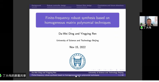2022年11月15日(星期二)晚上19:00,受色播 复杂系统智能分析与控制团队邀请,北京科技大学丁大伟教授作了题为“基于齐次矩阵多项式技术的有限频域鲁棒综合问题研究”的报告。本次报告以腾讯会议的形式举行,报告由解相朋教授主持,色播 相关专业老师和研究生在11号教学楼B207参加了本次报告。