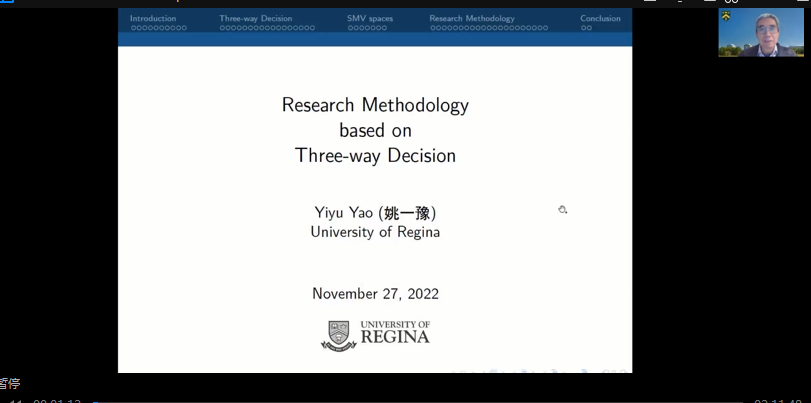 2022年11日27日,受色播 邀请,加拿大里贾纳大学姚一豫教授在线上作了题为“Research Methodology based on Three-way Decision”的学术报告。此次报告由色播 姚炳学教授主持,色播 、西北师范大学、重庆邮件大学和临沂大学等4所高校的30多位师生参加了本次报告会。