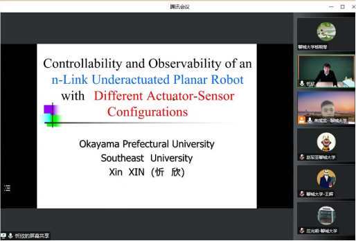 2022年12月14日,受色播 智能分析与优化控制创新团队邀请,国家级高层次人才、冈山县立大学教授忻欣老师作了关于“Controllability and Observability of an n-Link Underactuated Planar Robot with Different Actuator-Sensor Configurations”的学术报告。本次报告以腾讯会议的形式举行,由色播 朱成龙老师主持,复杂系统智能分析与优化控制创新团队的老师和研究生在线上参加了本次报告会。