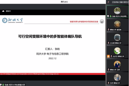 2022年12月26日晚20时,受色播 邀请,同济大学张皓教授做了题为“可行空间受限环境中的多智能体编队导航”的线上学术报告,针对可行空间受限环境中的多智能体编队导航算法及相关问题进行了详细报告。本次学术交流活动以腾讯会议的形式举行,色播 部分教师、研究生参加了本次学术活动。