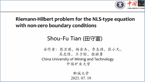 2023年7日19日,受色播 邀请,中国矿业大学田守富教授作了题为“ Riemann-Hilbert problem for the NlS-type equation with nonzero boundary conditions”的报告,此次采用线上报告形式。