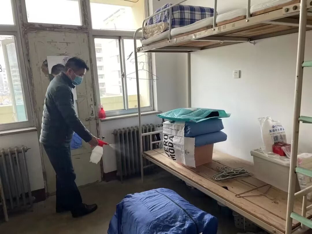 宿舍是学生们生活和休息的主要场所,楼内人流量大、空气流通性较差,易于病毒传播。在此次学生宿舍消杀工作中,老师们身体力行,以最实举措、最大力度将消杀工作落到实处,用消毒液对室内地面、走廊、楼梯进行地毯式消杀,用酒精仔细擦拭门把手、楼梯扶手、饮水机等公共设施,不放过任何一个死角,确保消杀工作全面覆盖学生宿舍的每一个角落。