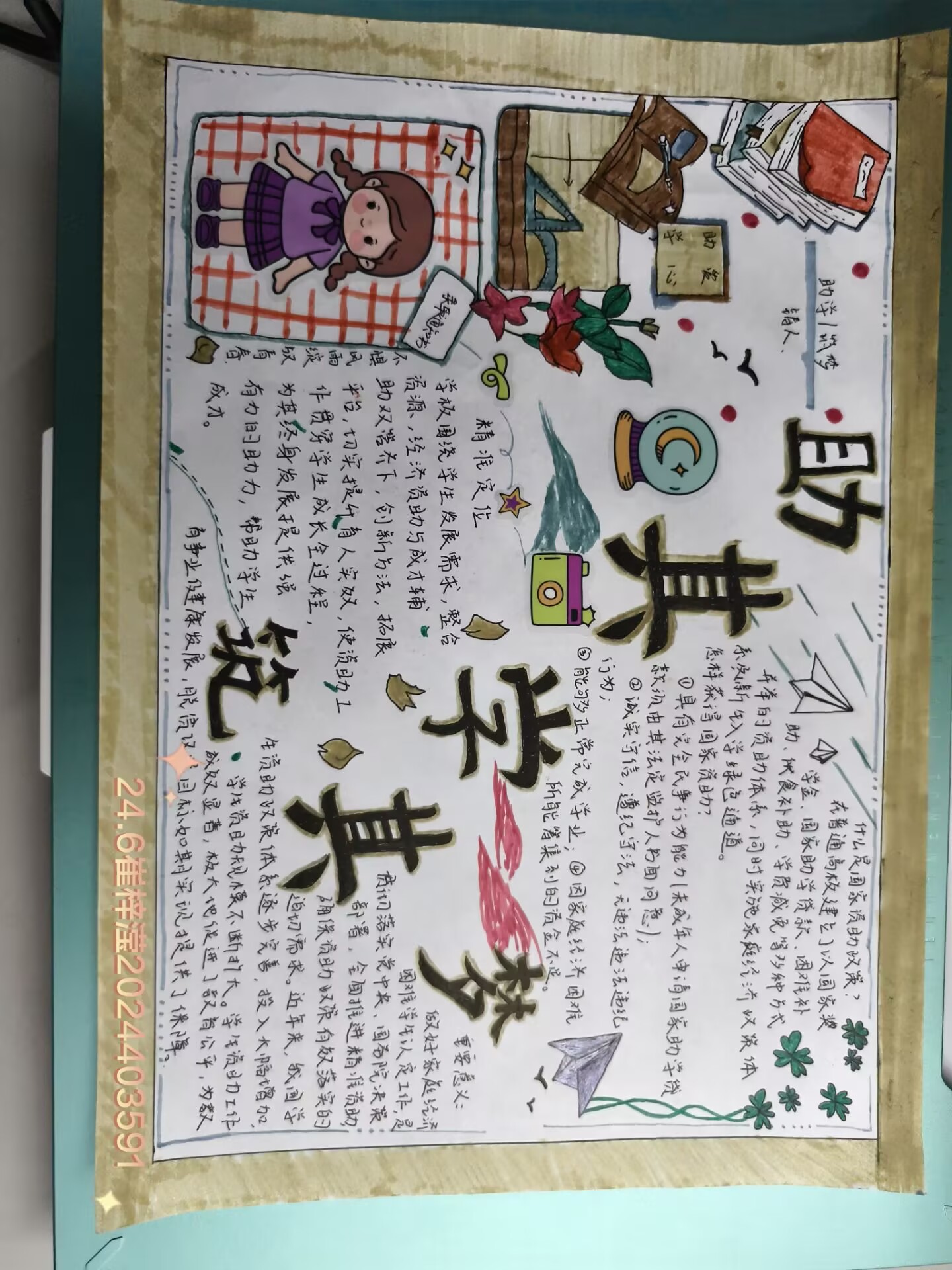 为增进同学们对资助政策的了解,激发他们的学习动力与追梦热情,12月2日到12月6日,色播 勤工助学中心于线上举办“助其学,筑其梦”手抄报活动,2021级、2024级部分学生参加。