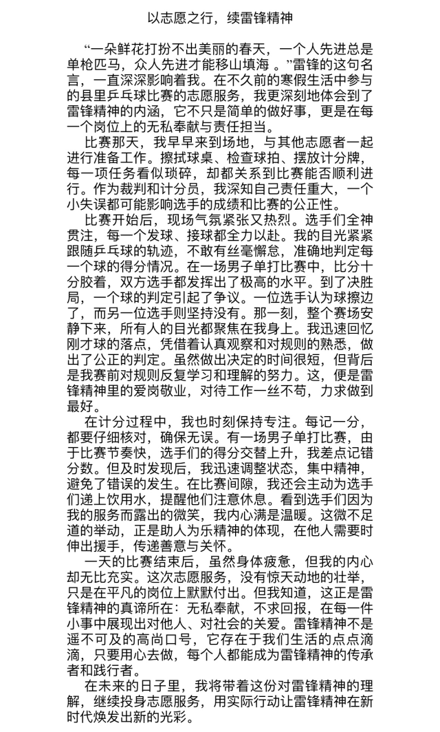 此次征文活动以文字凝聚力量,加深学生对雷锋精神的理解,增强学生社会责任感,营造学院互帮互助、积极向上的良好氛围。展望未来,学院将继续以实际行动书写新时代的雷锋故事,让雷锋精神化作温暖人心的行动。