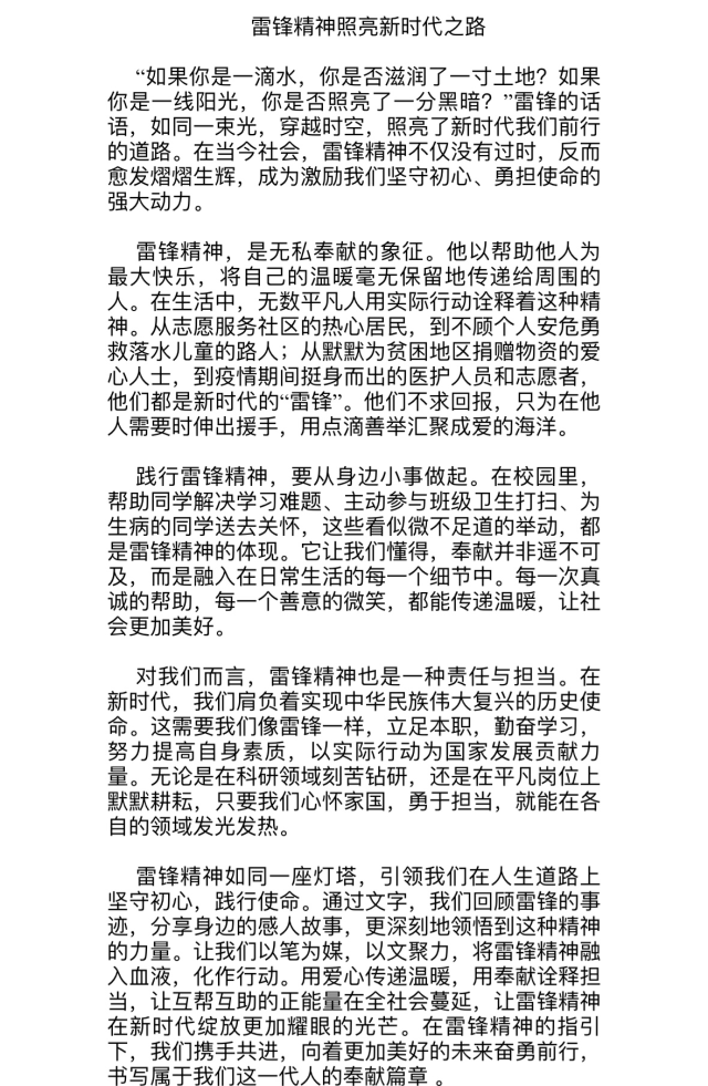 为引导学生学习雷锋精神,感悟无私奉献、助人为乐、爱岗敬业的精神内涵,推动雷锋精神在新时代焕发新光彩,3月6日-8日,色播 于线上开展“学雷锋精神,守初心使命”主题征文活动。本次活动2023级、2024级部分学生参加。