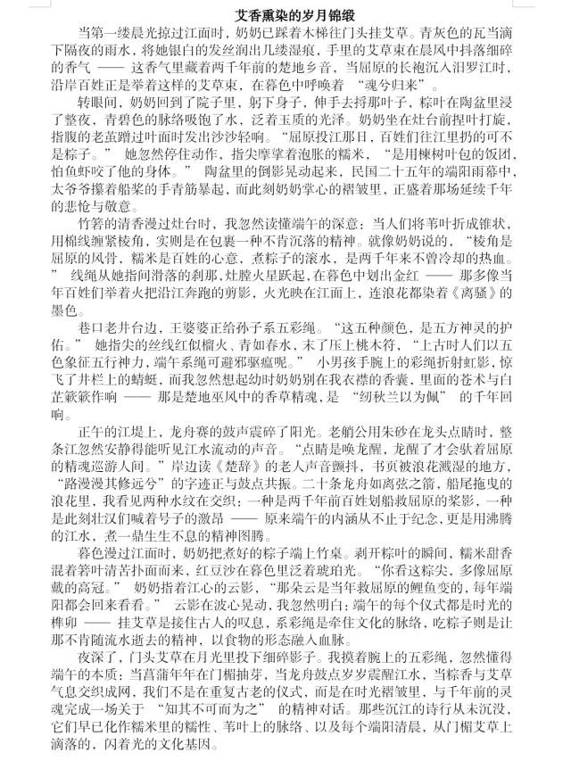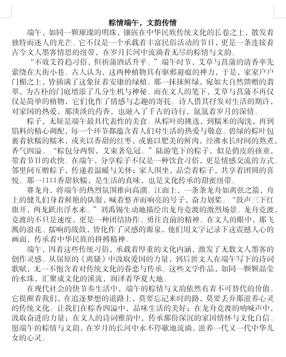 参与者紧扣主题,潜心创作,用文字深情描绘端午节画卷。他们或追溯历史长河,书写屈原的爱国情怀与不朽精神,赋予古老传说时代新意;或聚焦乡土记忆,细腻描摹家乡独特的粽香、热闹的龙舟竞渡、门楣悬挂的艾草菖蒲,在字里行间流淌着对故土和亲情的眷恋;或品味人间烟火,将儿时围坐包粽的温馨场景、家人团聚的欢声笑语化作动人篇章,让传统节日承载的浓浓亲情跃然纸上;亦或是深入思考文化传承,探讨端午节俗在现代社会的意义与价值,抒发对守护民族精神根脉的感悟。一篇篇征文,不仅内容积极向上,情感真挚饱满,更如同片片箬叶,包裹着同学们对传统文化的理解、对家国情怀的抒发以及对生活美好的赞颂。