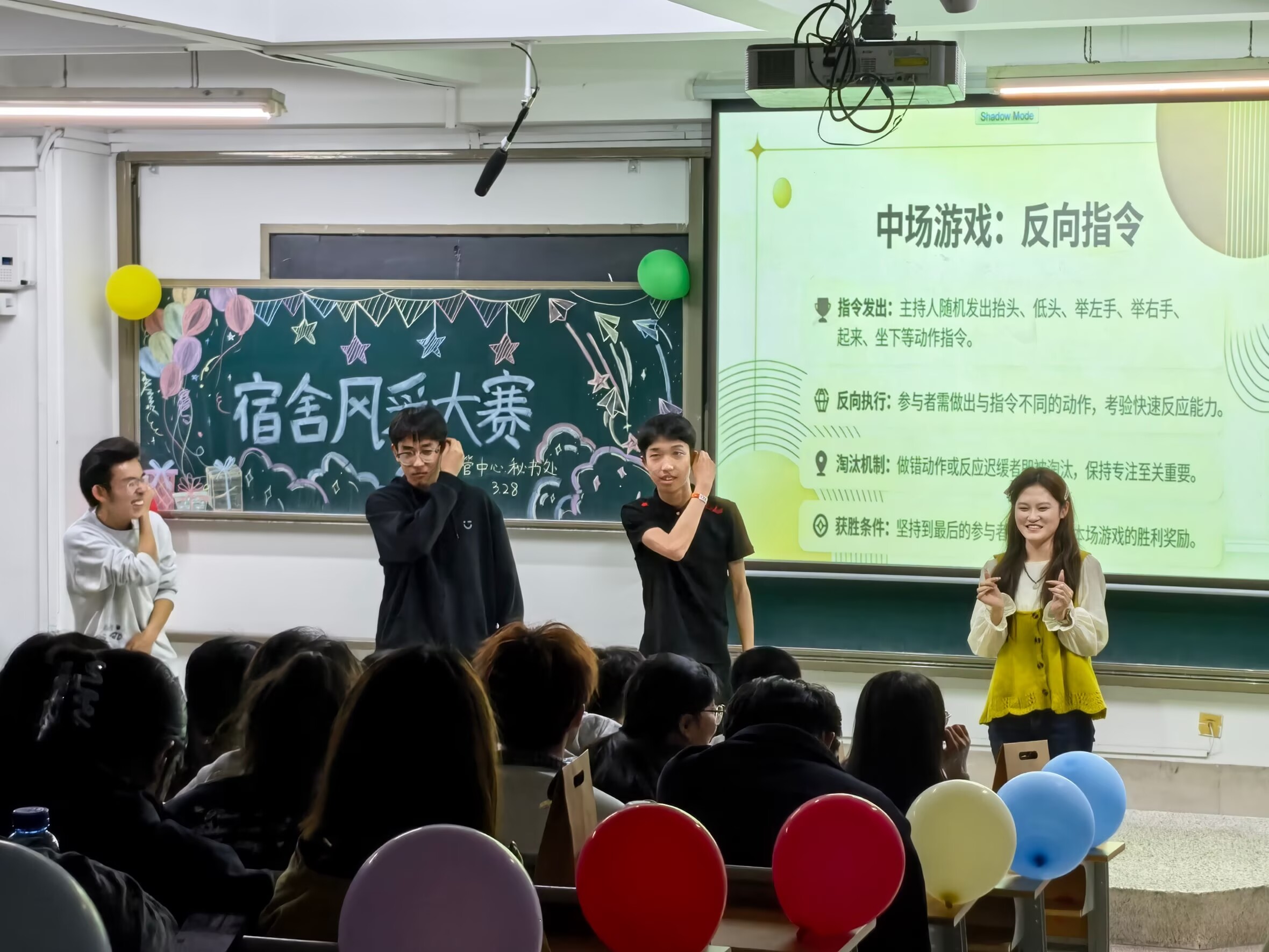中场休息环节,主持人组织开展趣味互动游戏,轻松有趣的游戏形式让现场氛围持续升温,欢声笑语此起彼伏,不仅活跃了现场气氛,更有效拉近了同学们之间的距离,让宿舍情谊在互动中进一步升华。