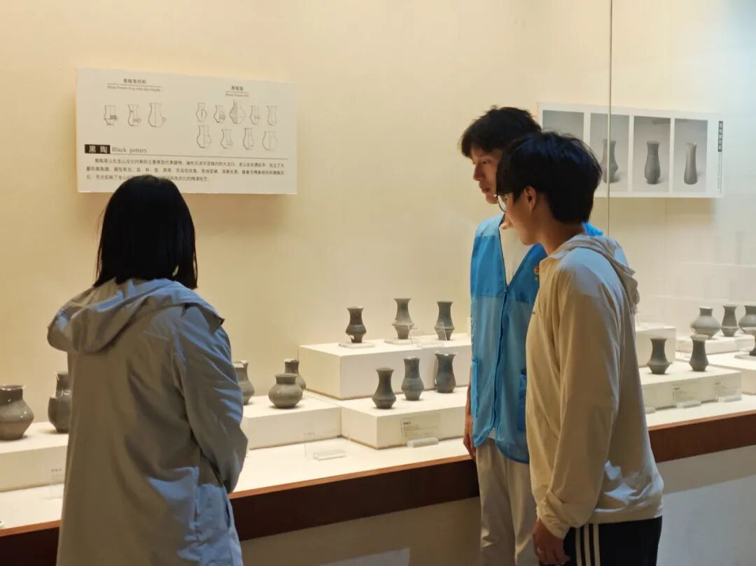 活动伊始,实践团队走进博物馆展厅,认真观察龙山文化薄如蛋壳的黑陶杯,欣赏汉代纹饰繁复的储物罐和近现代作品的简洁线条,仔细对比不同时期黑陶在器型、纹饰和工艺上的变化,详细记录其中的历史故事与文化意义。他们在展品前驻足交流探讨,面对工匠精湛的技艺,接连赞叹。