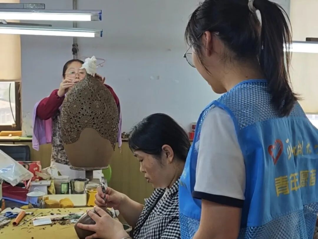 随后,团队来到黑陶工艺制品有限公司的互动区,亲身体验揉泥、塑形等黑陶制作基础步骤,在指尖与陶泥的接触中感受工艺的独特之处,还向现场工作人员询问传统技艺在当下的传承方法。这让大家对“三分技艺,七分耐心”的匠人精神有了更真切的理解,同时了解到可以通过开设体验课、进校园宣讲等方式去推广黑陶文化。