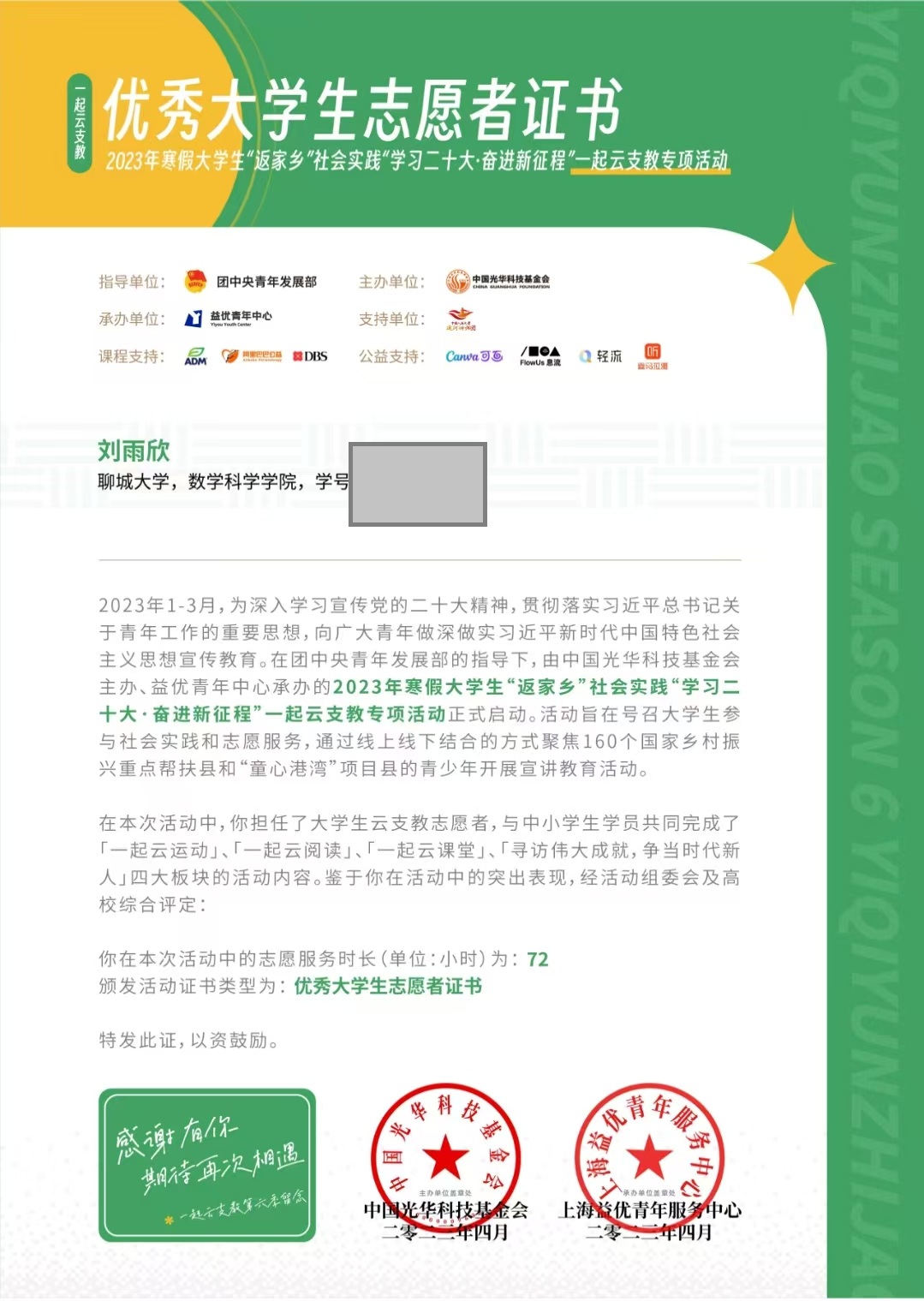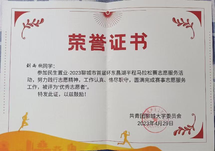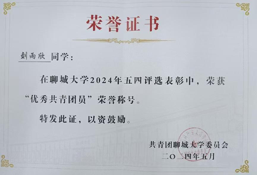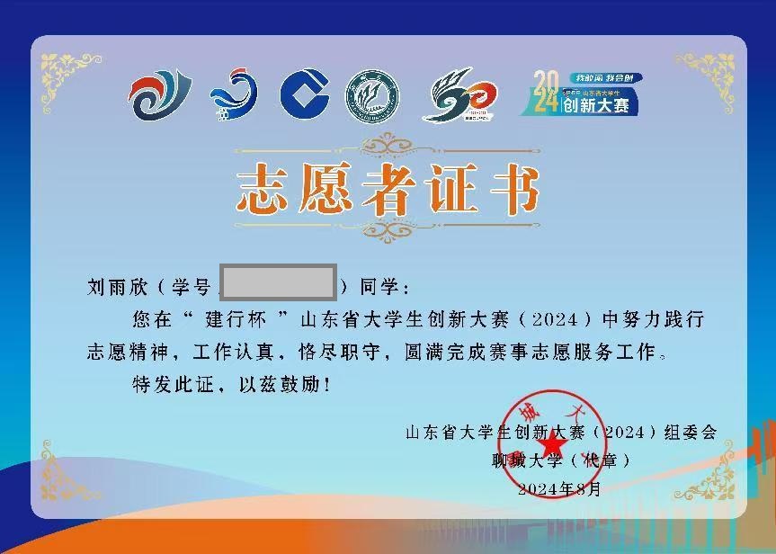 信念如磐,行稳致远,方能书写人生的华章。刘雨欣认真上好每一节思政课,积极参与学院及班级组织的思想政治活动和团支部活动,担任多个思政课的课程助教,在思想道德品质上严格要求自己,积极向党组织靠拢,荣获“优秀共青团员”称号。此外,她热心公益,积极参与志愿服务活动,获得一起云支教、环东昌湖半程马拉松赛志愿服务活动以及山东省创新创业大赛志愿者证书,展现了高尚的道德情操和无私的奉献精神。
