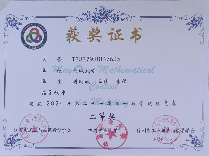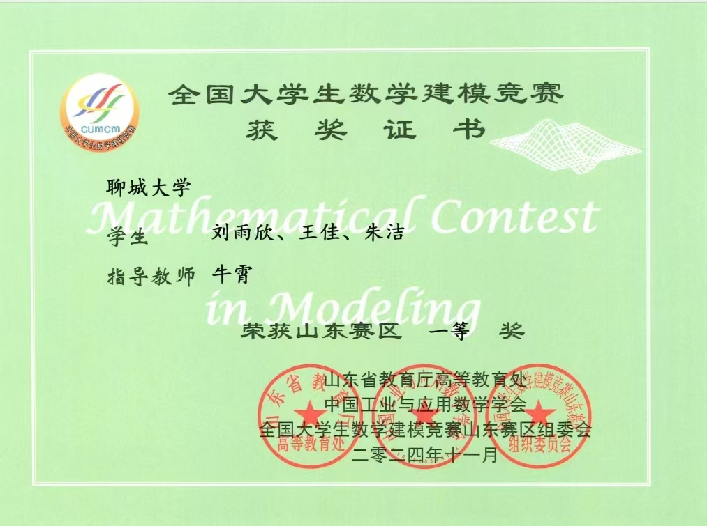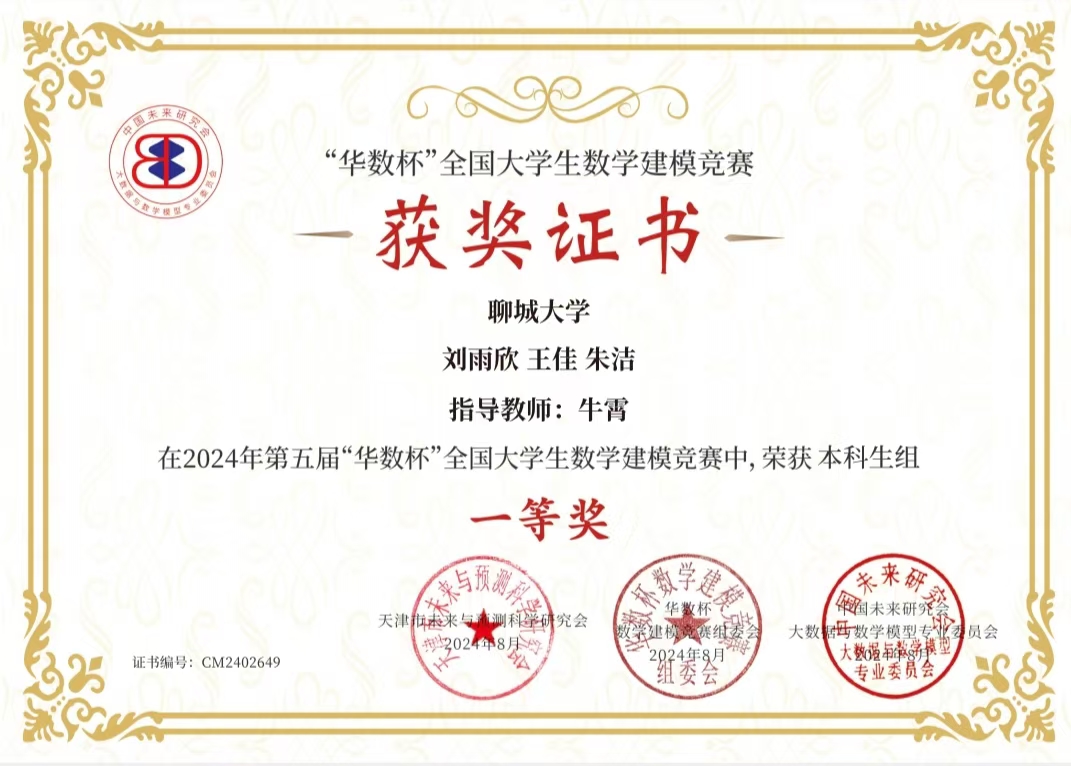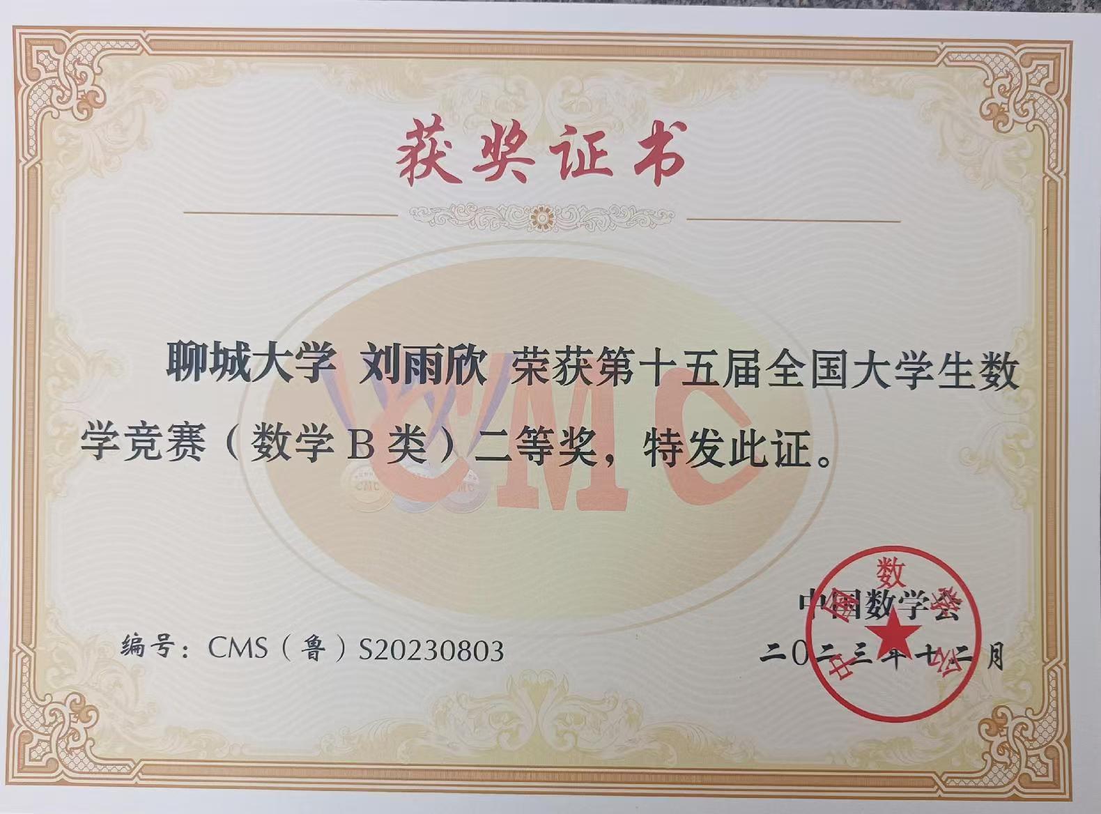 学海无涯,唯有勤勉者方能抵达彼岸。刘雨欣以严谨的态度和满腔的热情投身于学习中,态度端正,努力刻苦,积极主动地探索知识,形成了高效的学习方法。在大一至大二学年中,她连续两个学年专业成绩排名第一,展现了卓越的学术能力。她深知英语在国际化背景下的重要性,秉承“以赛助学”的理念,先后获得全国大学生英语词汇能力大赛一等奖和英语演讲比赛三等奖,顺利通过英语四级和六级考试。此外,她积极参加各类学科竞赛,获得全国大学生数学竞赛二等奖、“华数杯”全国大学生数学建模竞赛本科组一等奖、第二十一届五一数学建模竞赛二等奖以及全国大学生数学建模竞赛省级一等奖,不断锤炼和提升自己的专业技能。