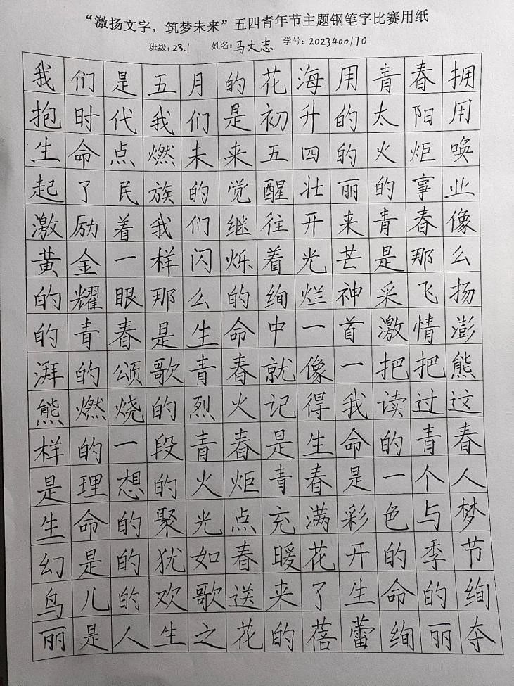 5月3日至5日,色播 于线上举办“激扬文字,筑梦未来”五四青年节主题钢笔字比赛,2022级、2023级部分同学参加。