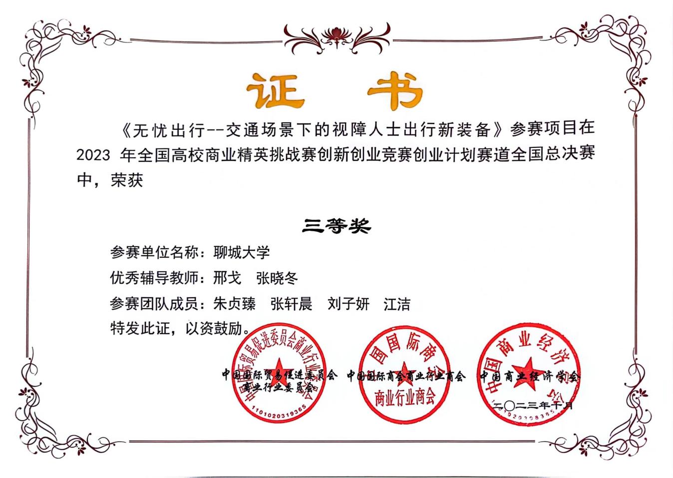2023.10 全国高校商业精英挑战赛创新创业竞赛创业计划赛道全国总决赛三等奖