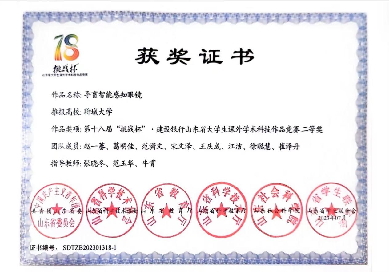 2023.07 第十八届“挑战杯”山东省大学生课外学术科技作品竞赛二等奖2023.08 全国高校商业精英挑战赛创新创业竞赛创业计划赛道山东省总决赛一等奖