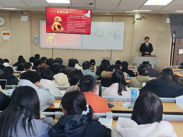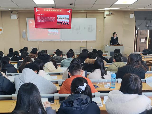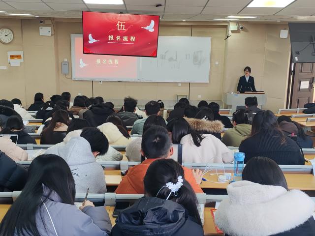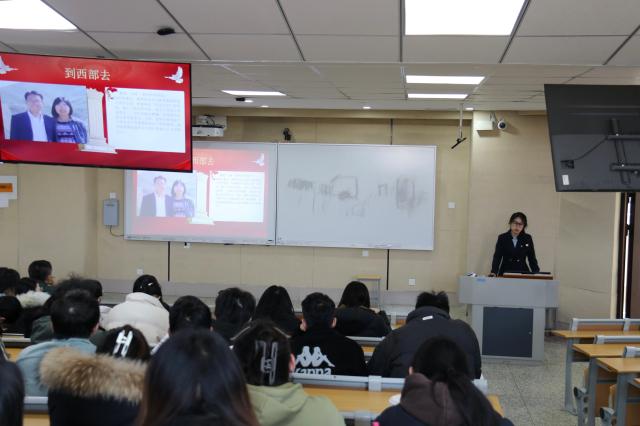 活动伊始,宣讲人以青年梦想为主题开篇,引出广大青年投身西部、建设西部的话题,并播放了西部计划主题宣传片,视频中展现了志愿者投身西部的工作经历和众多学子前往西部的足迹,伴随着“到西部去,到基层去,到祖国最需要的地方去”的铿锵誓言,将现场氛围推向高潮。接着,宣讲人详细解读政策内容,从报名条件、服务领域、保障机制及职业发展支持等方面阐释西部计划,助力学生深入了解西部计划的具体实施要求。宣讲人通过图文并茂的演示,生动展现支教、支医等岗位的实践场景,同时,各种详实的数据与案例让在场学生深刻感受到奉献与收获同行,体会到西部计划的深层意义,有利地增强了学生的服务意识。