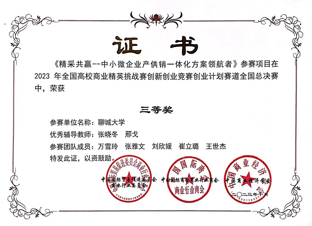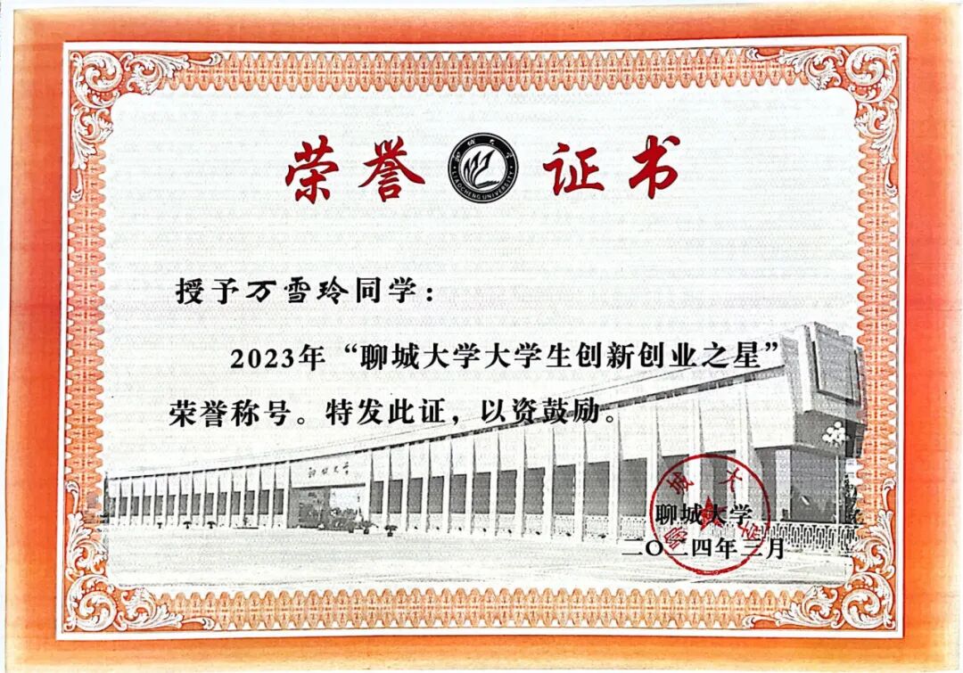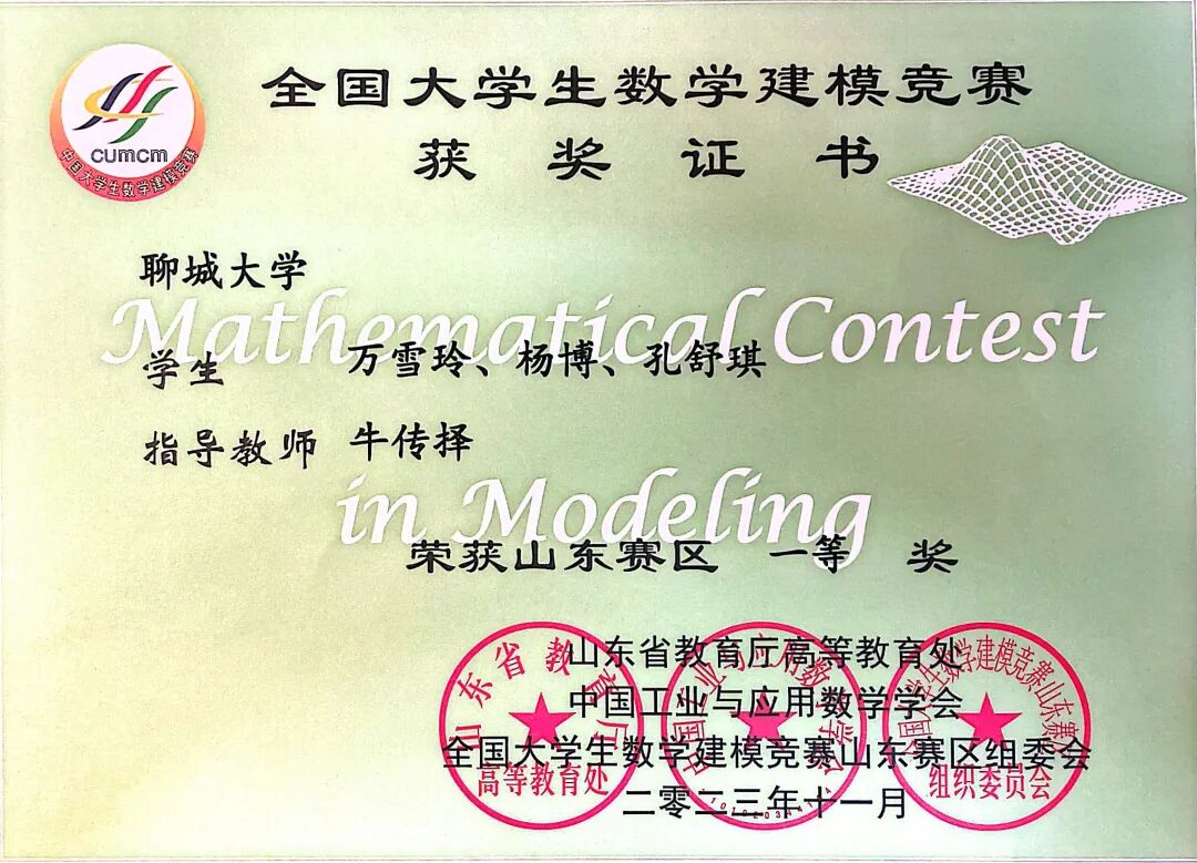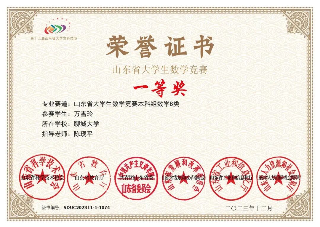 在扎实的专业基础上,万雪玲不断创新探索,刻苦钻研,积极参加各类赛事,提升自己的创新能力与创新思维,在实践中不断地锻炼自己。先后获得全国大学生数学竞赛(数学B类)一等奖、二等奖,全国大学生数学建模山东赛区一等奖,全国大学生英语竞赛二等奖,全国高校商业精英挑战赛创新创业竞赛总决赛三等奖(作为团队负责人)等多项奖项。以上成果的取得,正是因为她有一个坚定的信念,一定要做最好的自己,保持一个良好的心态——重在参与,享受其中!