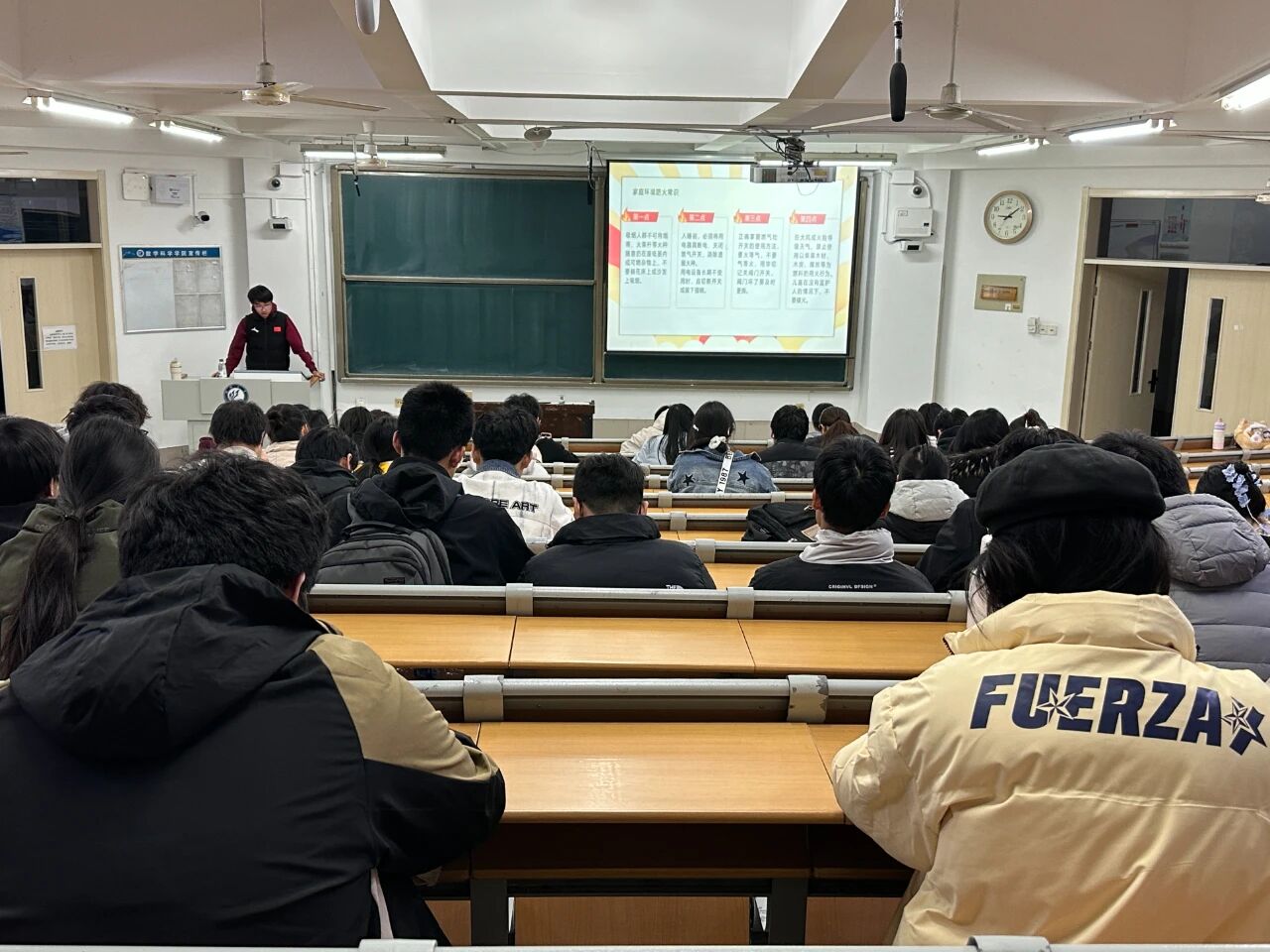 本次活动的分享内容包括消防基础知识、认识消防设施、预防与灭火措施、火场自救与逃生四部分。活动伊始,工作人员以真实火灾案例为切入点,深入浅出地解析了校园常见火灾隐患、初期火灾扑救技巧、疏散逃生注意事项等内容,让在场舍长深刻意识到消防安全的重要性。随后,工作人员着重讲述了火灾预防措施,明确要求舍长及时督促宿舍成员做到“人走断电”,同时定期组织宿舍学习安全规范,将预防要求融入日常管理,从源头规避火灾风险。活动最后,工作人员呼吁各位舍长要以此次活动为契机,当好宿舍消防“第一责任人”,把所学消防知识精准传递给每一位舍友,共同守护宿舍安全防线。