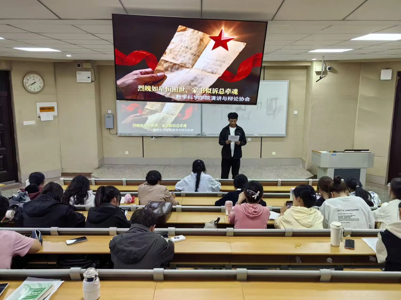 首先,武鑫琳向参赛选手详细阐释了本次活动的主题与流程,拉开了烈士纪念家书诵读的序幕。随后,选手们依次登台,声情并茂地诵读感人至深的烈士家书,他们的语调饱含着真挚的情感,或深沉舒缓,或激昂澎湃,仿佛带领大家重新回到了那段保家卫国的热血岁月,传递出革命先辈“舍小家为大家”的家国情怀。一篇篇滚烫的家书,既是烈士对家国的铮铮誓言,也是对亲人的绵绵牵挂。参赛选手们以声为媒,与革命先辈跨越时空对话,让红色信仰在每位听众的耳畔真切传承。现场氛围庄严肃穆,参与者凝神静听,这是对烈士精神的共鸣,更是当代青年对革命先辈的崇高致敬。