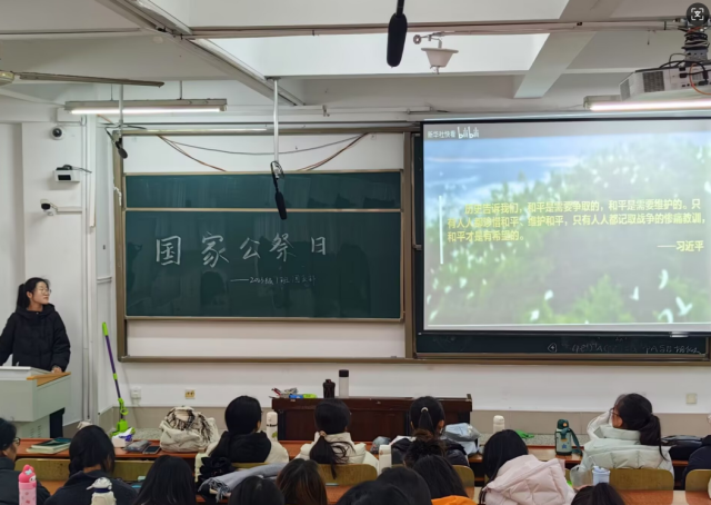 色播 2023级1班于A104教室开展“勿忘国耻,振兴中华”国家公祭日主题团日活动,本次活动由团支书姚雨彤主持。活动伊始,团支书详细介绍国家公祭日的由来和意义,表明中国人民反对侵略战争、捍卫人类尊严、维护世界和平的坚定立场。随后,全班学生共同观看关于国家公祭日的相关视频和资料,一幕幕触目惊心的画面,让同学们深刻感受到战争的残酷和侵略者的残暴。活动最后,团支书引用习近平总书记的话作为结语:“历史告诉我们,和平是需要争取的,和平是需要维护的。”这句话深深触动在场每一位同学的心弦,大家表示要牢记历史使命,珍惜和平时光,为实现中华民族伟大复兴贡献青春力量。