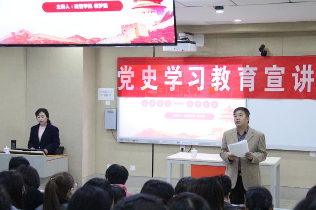 在中国共产党成立一百周年之际,为深入学习贯彻习近平新时代中国特色社会主义思想,巩固深化“不忘初心、牢记使命”主题教育成果,扎实推进党史学习教育。2021年4月22日下午,色播 邀请色播 党史学习教育宣讲团成员何梦茹为色播 全体教职工及学生党员进行党史学习教育宣讲,宣讲报告的题目是《百炼成钢 ——中国共产党的百年光辉》。