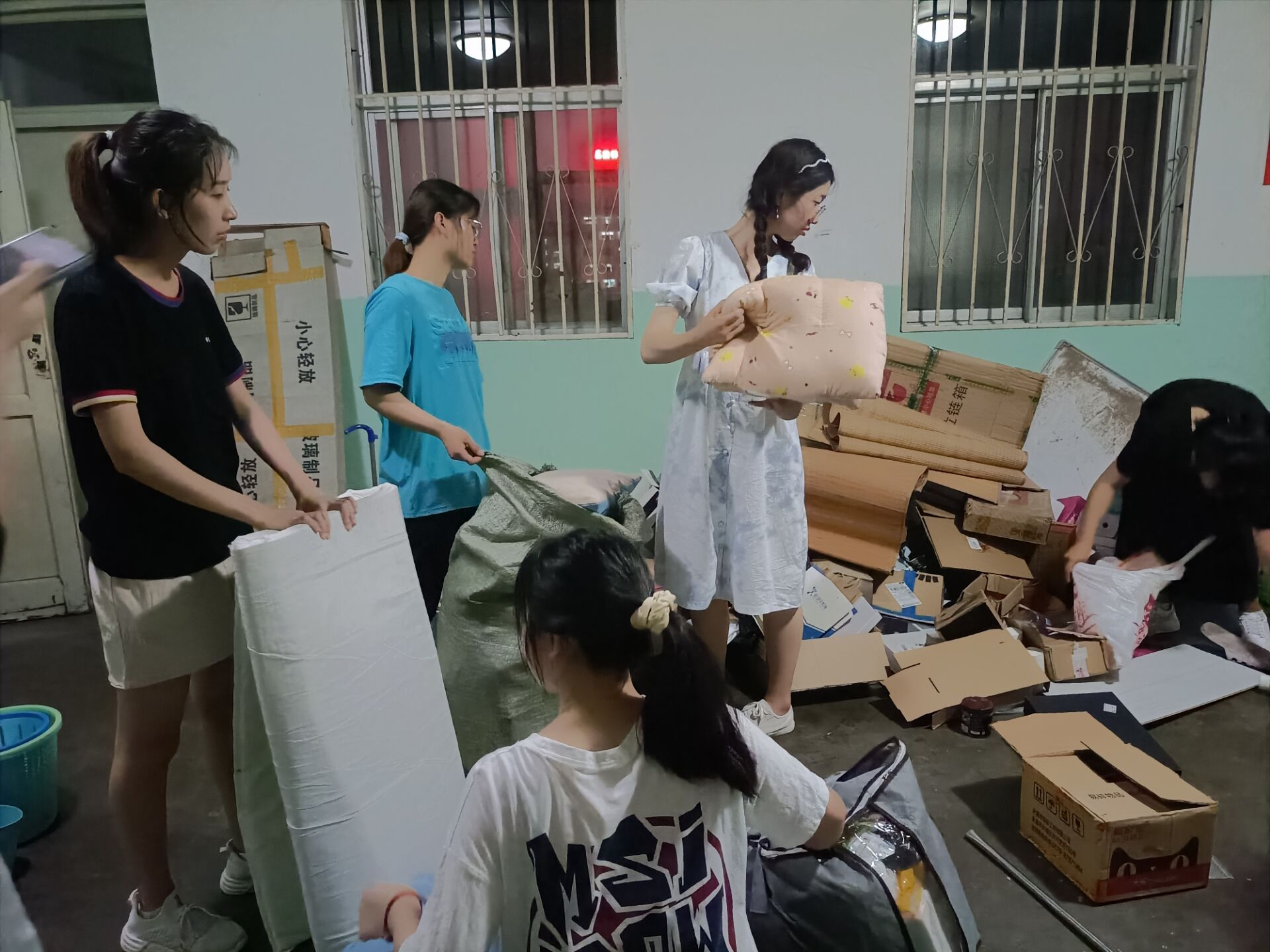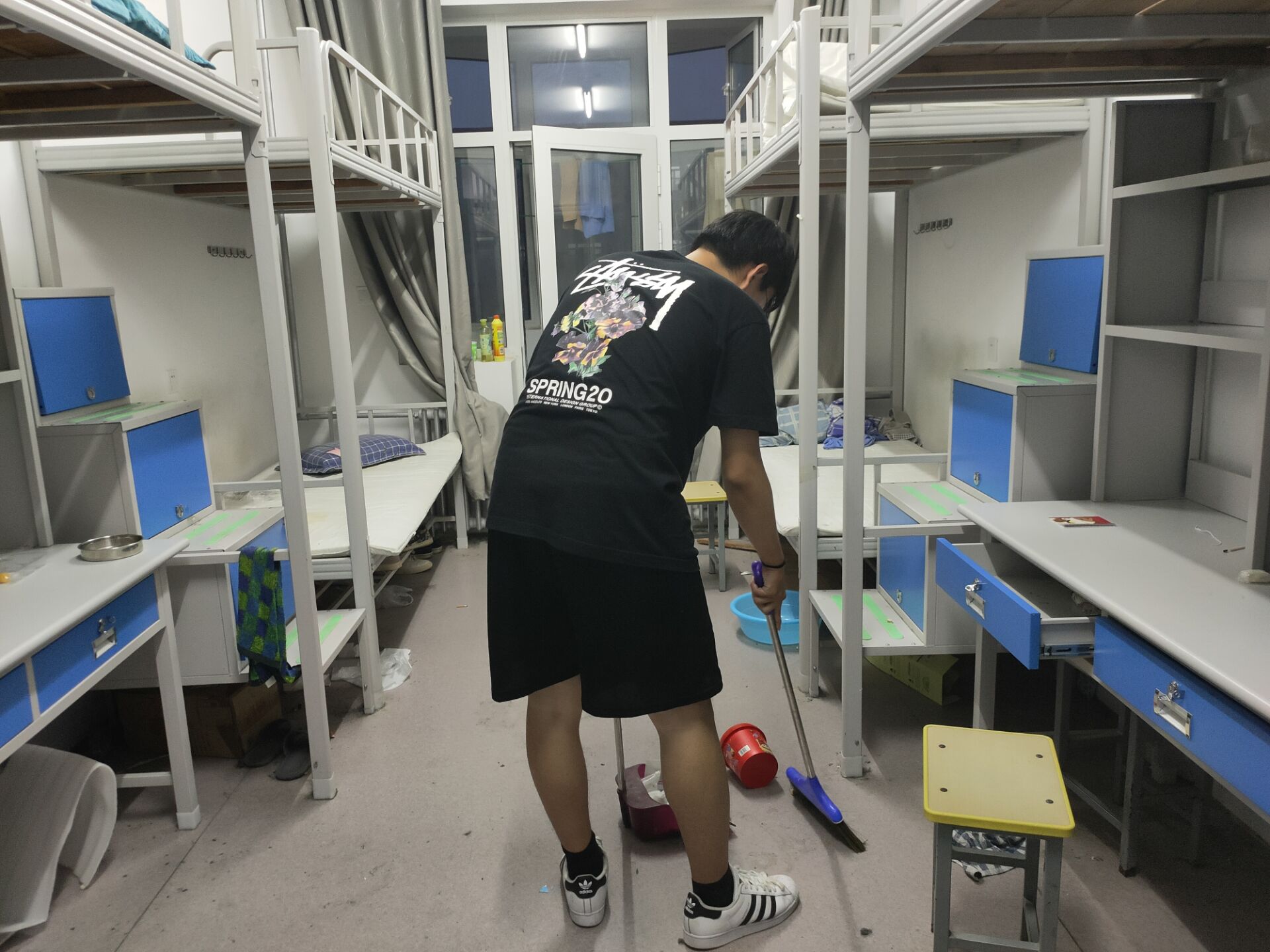 参与活动的学生带着清洁工具来到宿舍楼,进到每间毕业生宿舍,擦拭桌面,清洁地面,清除宿舍垃圾。将阳台上的衣物收到屋内,将散落在床上、悬挂在床头的衣服认真收起来,将毛巾等纺织品逐一收起,将鞋子整齐地摆放到床下,以免喷洒消毒液时损伤衣物、鞋子等物品。清扫工作结束后,关闭门窗,消除安全隐患,将垃圾拎下楼。尽管天气炎热,但同学们化身收纳能手,将宿舍物品归置到合适位置,大家团结协作,发扬不怕脏不怕累的精神,服从调遣,合理分工,经过2个多小时的劳动,毕业生宿舍整洁有序,焕然一新。