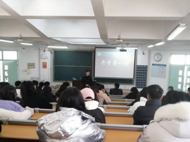 活动伊始,刘学彦总结了上一学期班里的总体情况以及期末成绩,指出了同学们的不足,向大家提出了改进意见及新学期的学习目标。随后,张进军从“疫情防控和生命安全”、“明确人生目标、做好职业生涯规划”等方面展开本次教育演讲课。 张进军着重强调2月19日、20日来自全国各地的学生返校,要求同学们在校期间要做到戴口罩、勤洗手、多通风,合理饮食,积极参加体育锻炼,养成良好卫生习惯和健康生活方式,遵守学校防疫规定,继续保持疫情防控的警惕性,确保在校安全健康。