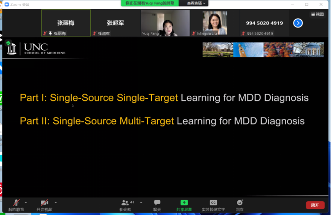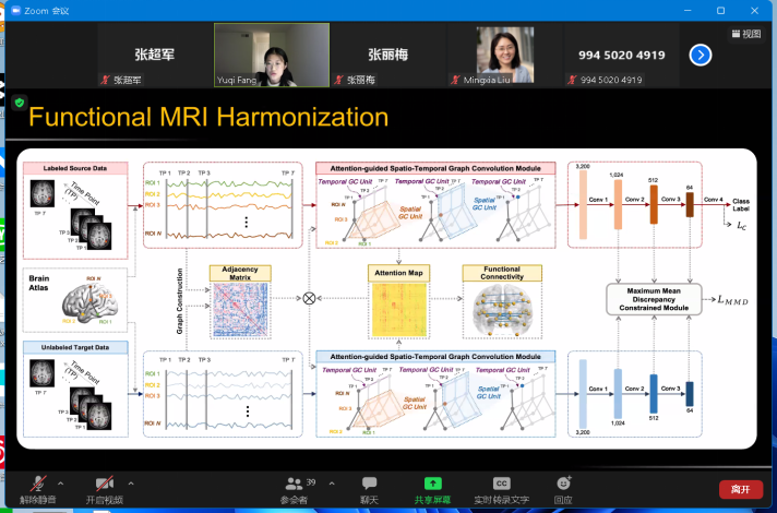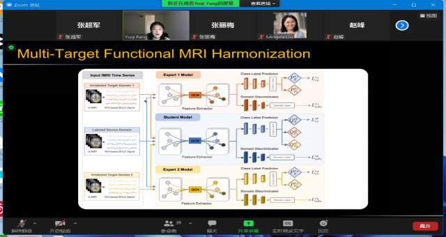 2022年3月13日(星期日)上午九点,受色播 智能数据分析团队邀请,北卡罗来纳大学教堂山分校房钰棋博士后在线上做了关于Unsupervised Cross-Domain Functional MRI Adaptation for Major Depressive Disorder Diagnosis 的学术报告,除智能数据分析团队的全部教师和研究生参加以外,本次会议也邀请了其他高校的老师和学生参加,在会议中师生们进行了精彩的发言讨论。
