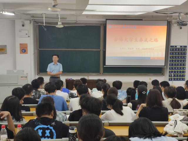 张进军以“大学生养成之路:成人成才方为合格”为主题,从认识自己、认识专业、认识社会三个方面展开讲述,深入分析了合格大学生的内涵和要求,多角度剖析了“自制、学习、挑战、健康”与合格大学生养成的关系。他强调,同学们要主动探索知识,及时总结并积极实践,实现全方面的发展。同时,他对同学们提出三点要求:一要努力提高个人综合素质,做一个“成人成才”的合格大学生;二要树立正确的人生目标,做好职业生涯规划;三要明确社会需求,将个人的发展与国家的前途命运紧密联系在一起。