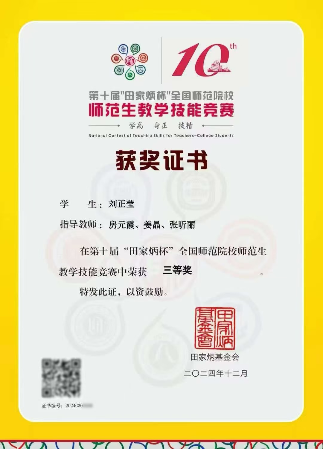 三、色播 刘正莹在第十届“田家炳杯”全国师范院校师范生教学技能竞赛中荣获全国三等奖