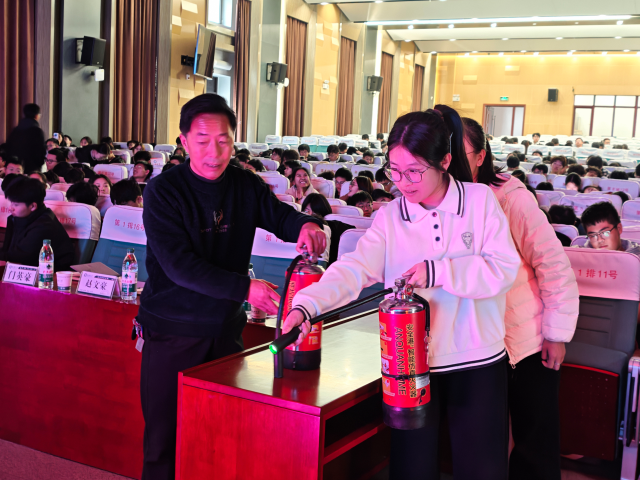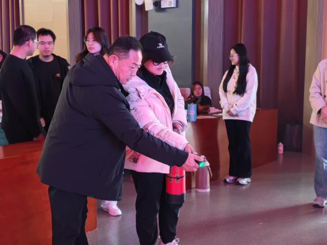 此次活动主要从火灾防范责任落实、火灾隐患的预防及措施、消防安全基本常识学习、消防器材操作及使用方法四个方面开展。活动伊始,马国栋指出落实火灾责任机制的重要性,他结合高校火灾典型案例向同学们阐述了火灾发生的原因和危害,重点指出实验室和学生公寓存在的消防安全隐患,并详细讲解了针对这些隐患的预防方法及措施。随后,马国栋系统阐述了消防安全“四个能力”和“四懂四会”核心要点,深入浅出地介绍了应对不同类型火灾的一系列的自救逃生方法。最后,马国栋向同学们演示了手提式干粉型灭火器的正确操作步骤和使用方法,叮嘱同学们使用灭火器时要沉着冷静,按步骤操作,牢记“提、拔、握、压”的操作口诀,同学们在其指导下现场操作灭火器进行模拟灭火演练,切实提高了对消防器材的实际操作能力。