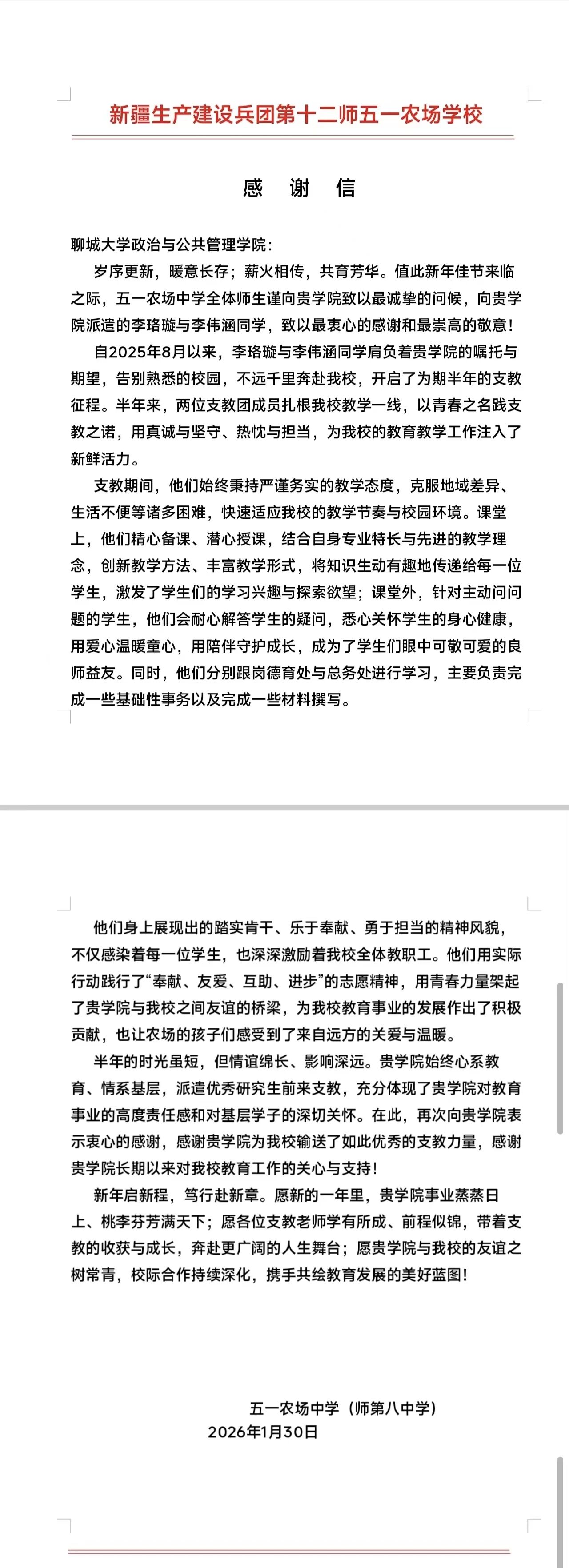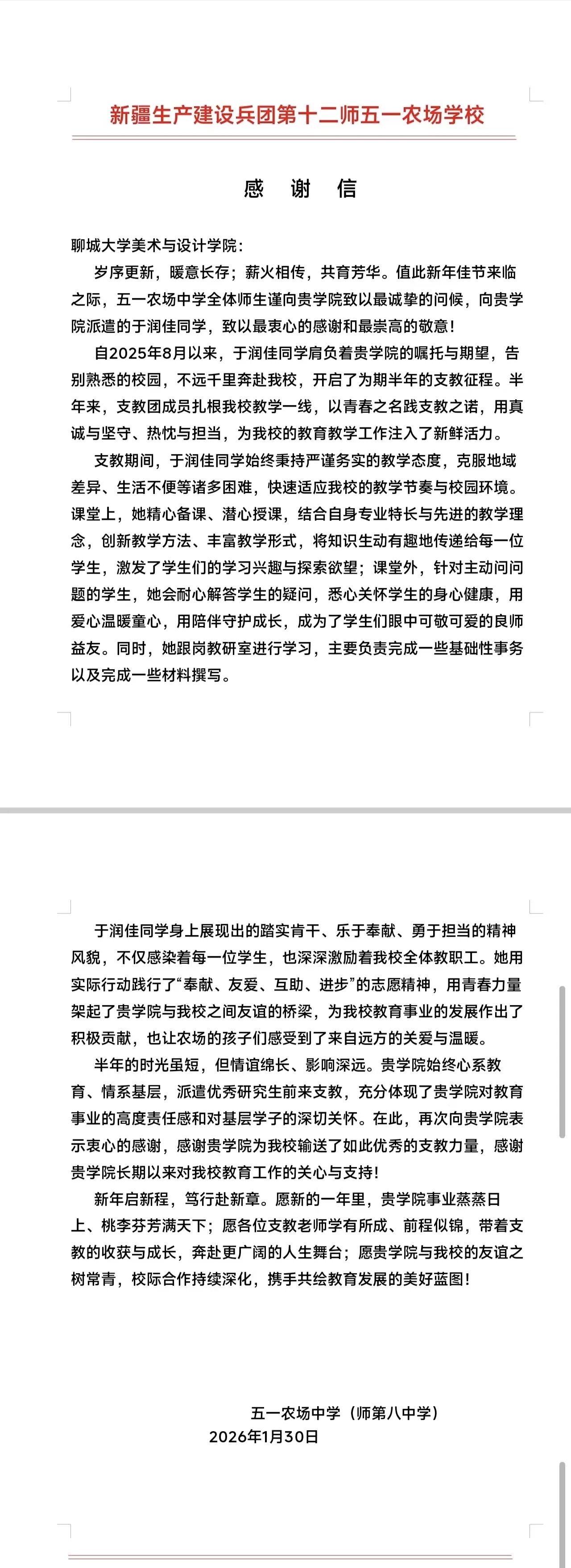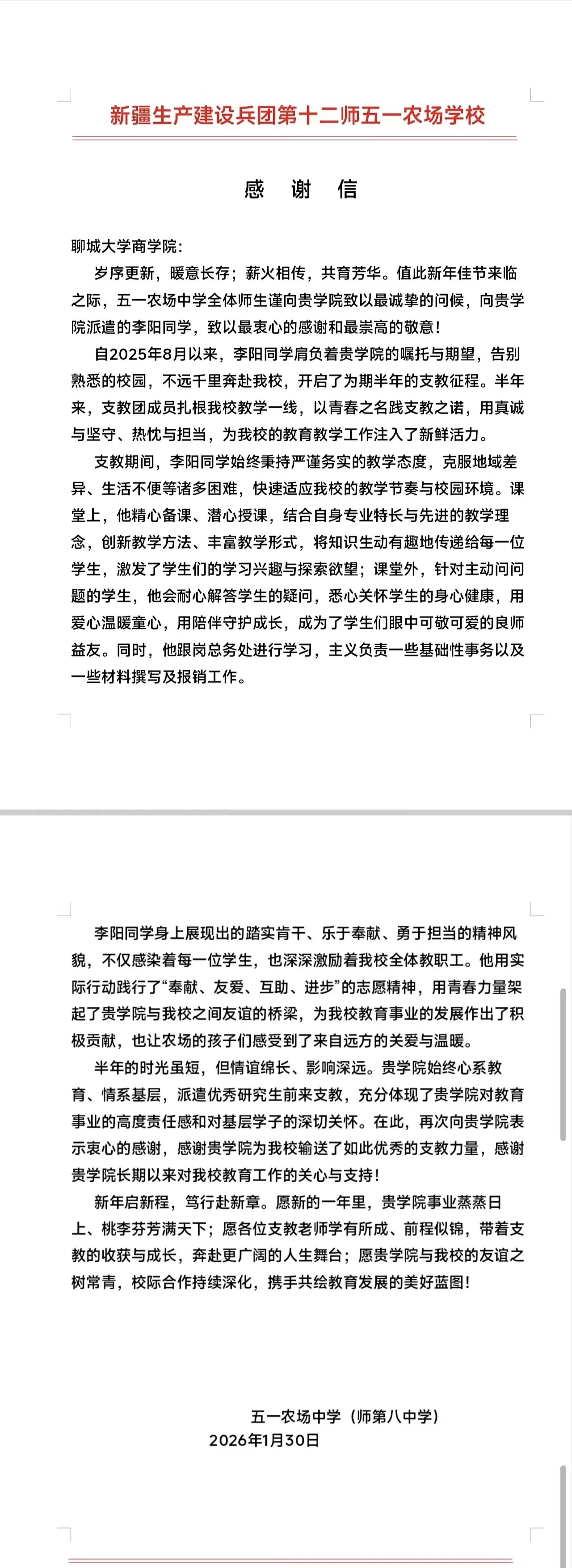 近日,我校第27届研究生支教团收到了来自服务地的特殊“礼物”。新疆生产建设兵团第十二师服务队9名志愿者收到支教学校送来的感谢信与锦旗,陕西富平服务队部分志愿者收到学生家长赠送的锦旗。英吉沙服务队9名志愿者被所在支教学校授予“优秀支教教师”荣誉称号。一面锦旗、一封感谢信、一张荣誉证书,跨越千山万水,传递着服务地师生对我校研支团工作的高度认可与深情厚谊。