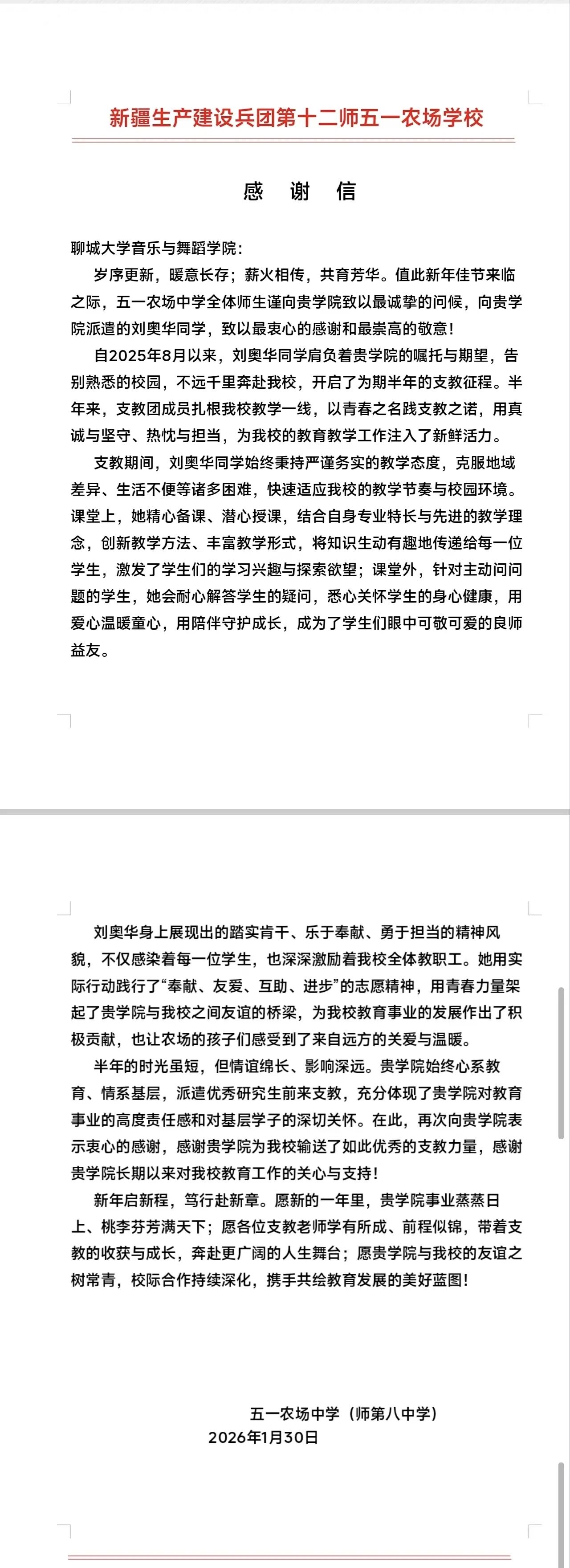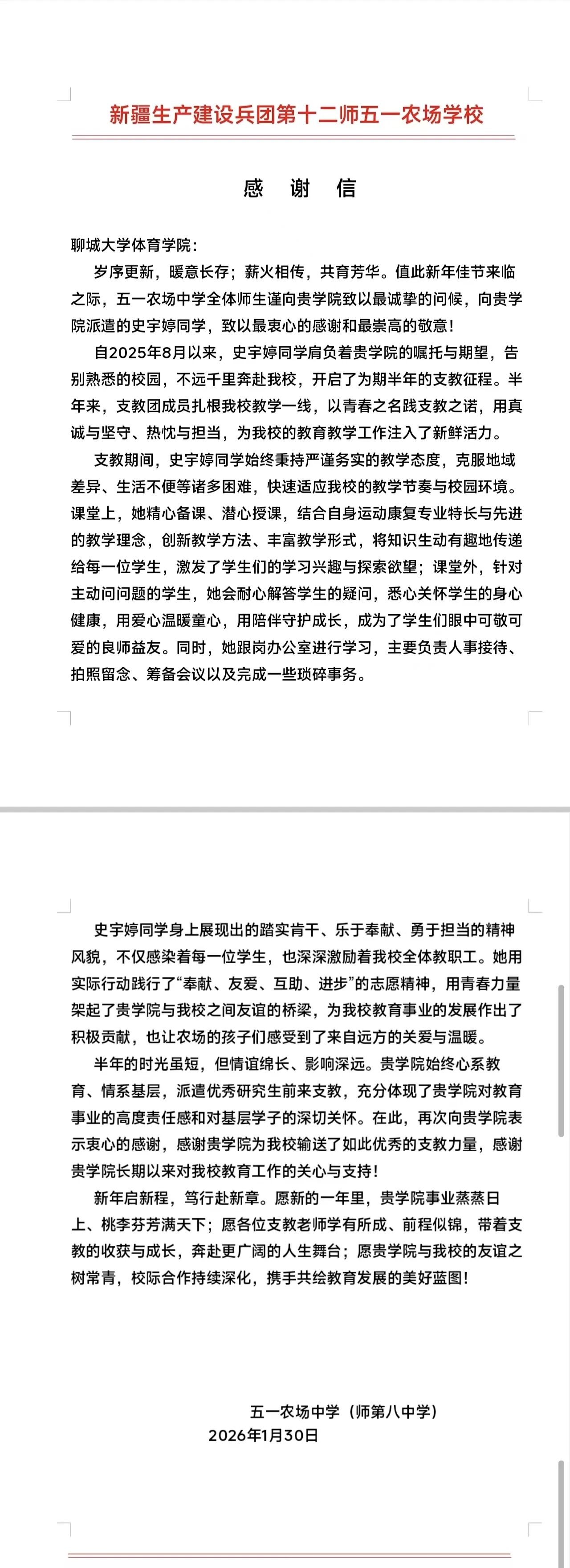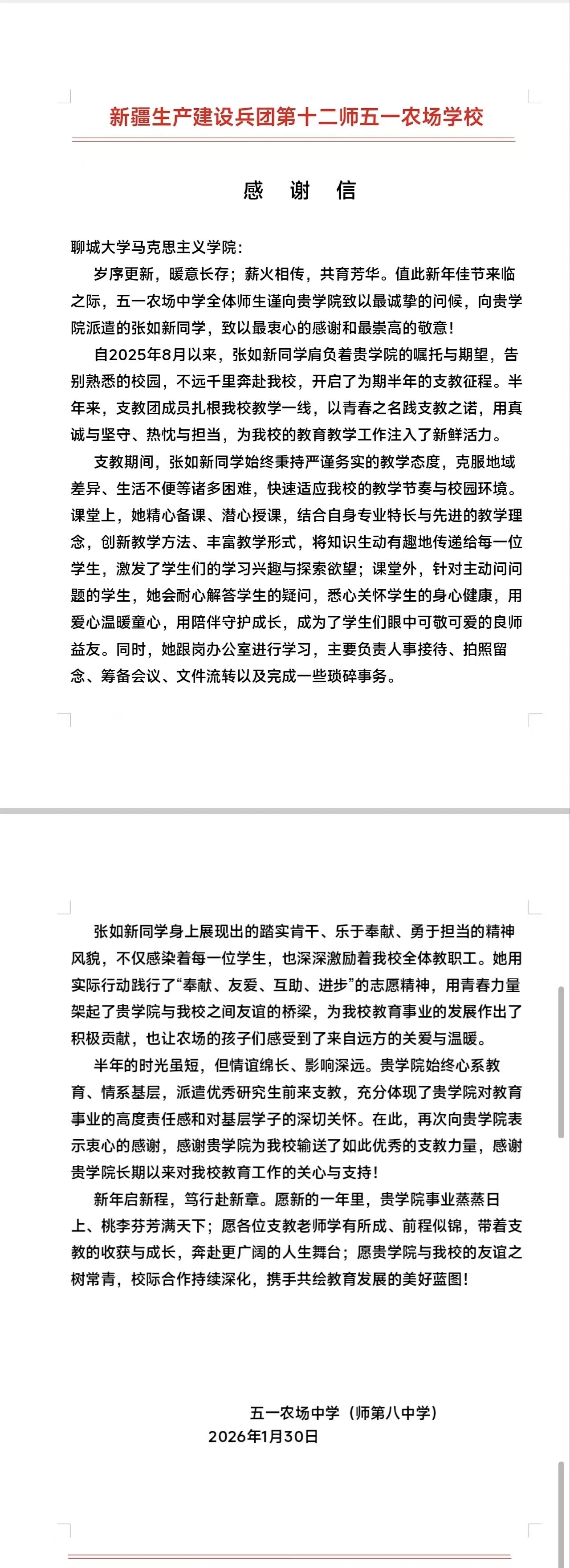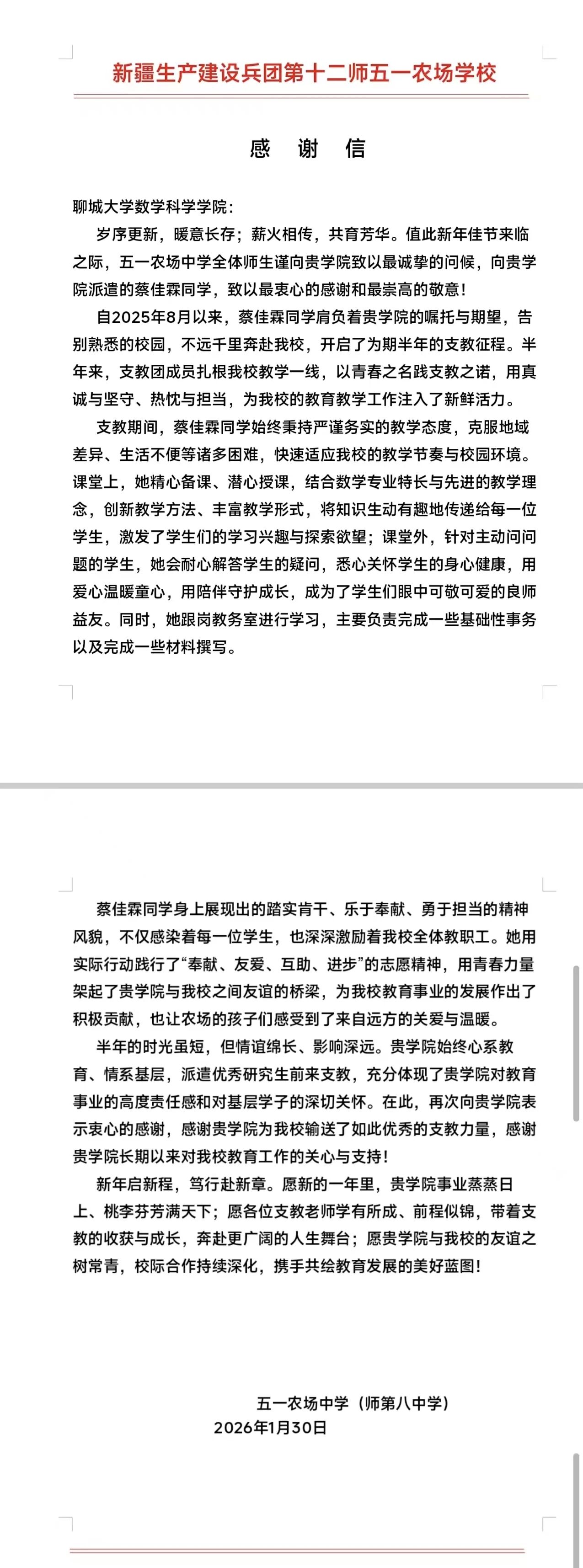 近日,我校第27届研究生支教团收到了来自服务地的特殊“礼物”。新疆生产建设兵团第十二师服务队9名志愿者收到支教学校送来的感谢信与锦旗,陕西富平服务队部分志愿者收到学生家长赠送的锦旗。英吉沙服务队9名志愿者被所在支教学校授予“优秀支教教师”荣誉称号。一面锦旗、一封感谢信、一张荣誉证书,跨越千山万水,传递着服务地师生对我校研支团工作的高度认可与深情厚谊。