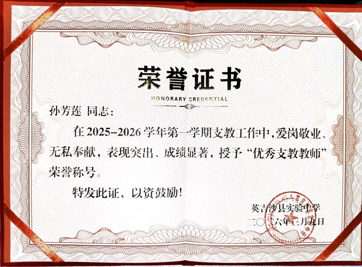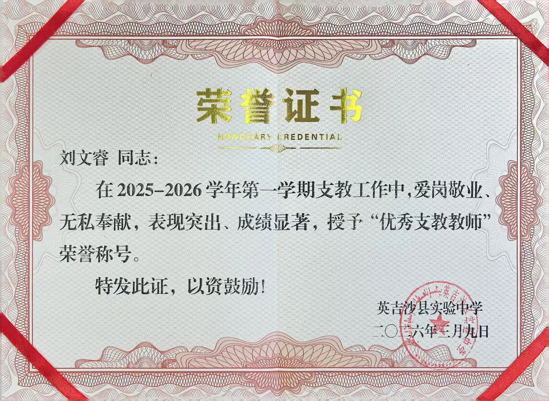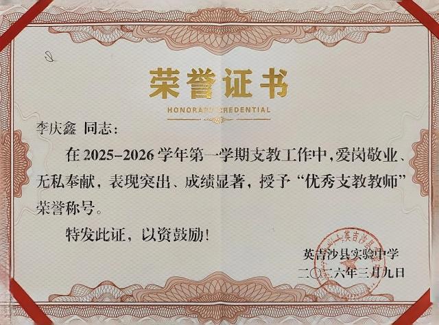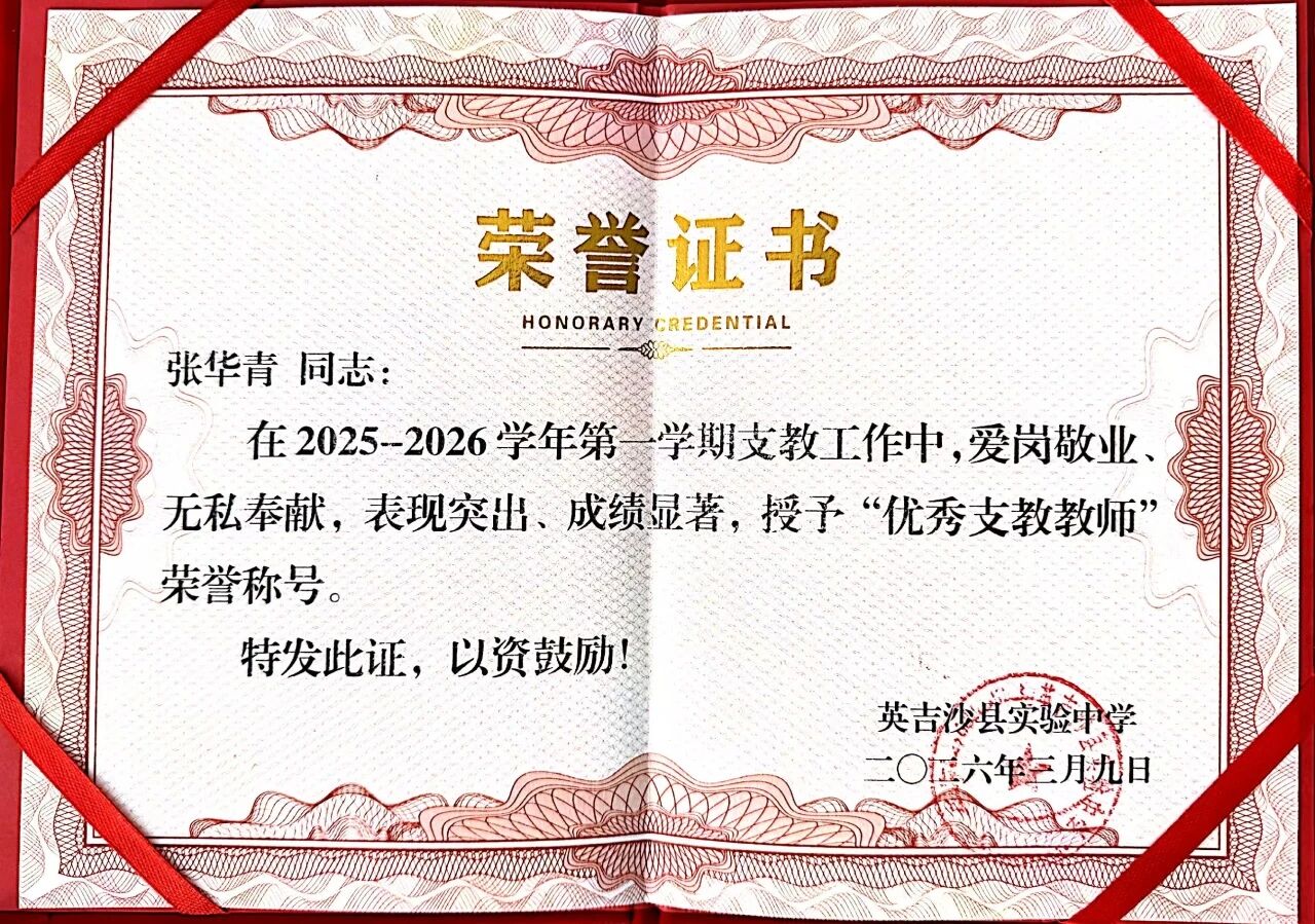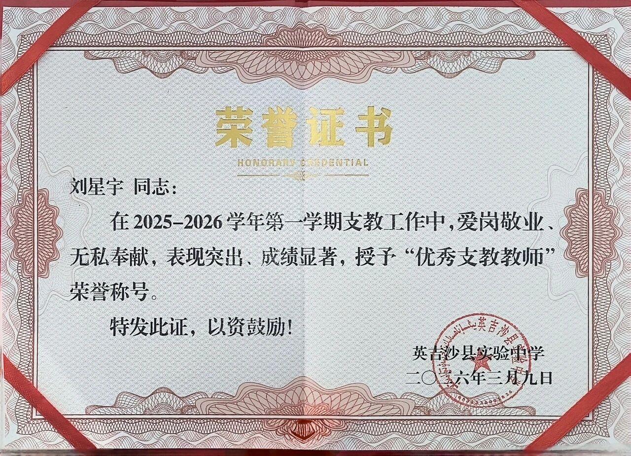 英吉沙服务队9名志愿者凭借在援疆支教期间的突出表现,被所在学校授予“优秀支教教师”荣誉称号。一本本鲜红的荣誉证书,不仅是对志愿者们个人辛勤付出的肯定,更是鲁疆情深的生动写照。半年来,英吉沙服务队的志愿者们克服恶劣气候、远离家乡等诸多困难,迅速融入当地教学环境,主动承担毕业班教学任务,创新教学方法,志愿者所带班级学业成绩均显著提升。他们积极参与“青蓝工程”师徒结对,与当地教师互学共进,利用周末时间开展家访,深入学生家庭了解情况,用真情温暖每一个孩子的心田。“这份荣誉属于我们整个团队,更属于所有关心支持援疆事业的聊大人。”手捧证书,志愿者们纷纷表示,将把这段宝贵的支教经历化为前行的动力,继续在各自岗位上发光发热,为促进民族团结、服务西部教育事业发展贡献青春力量。