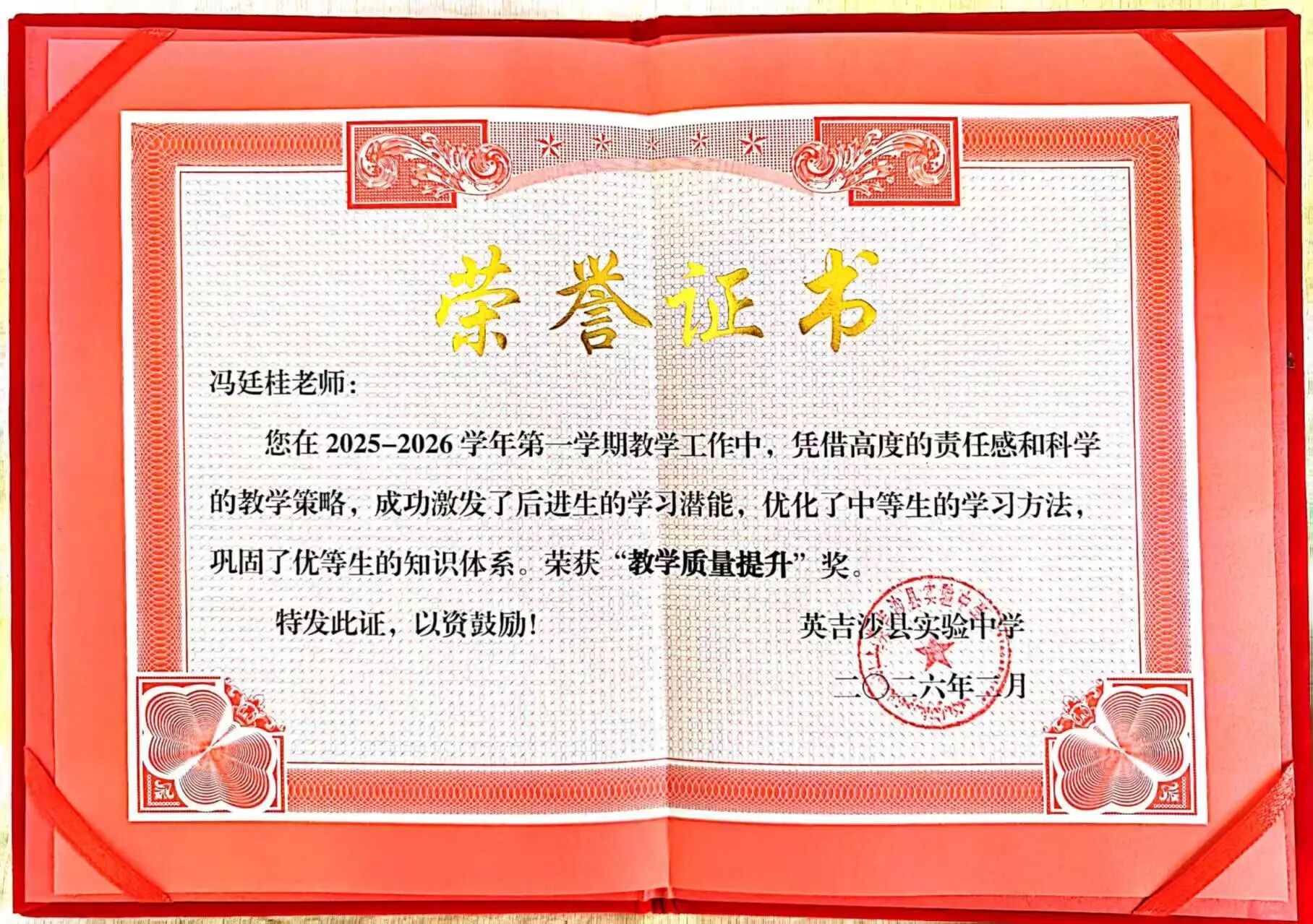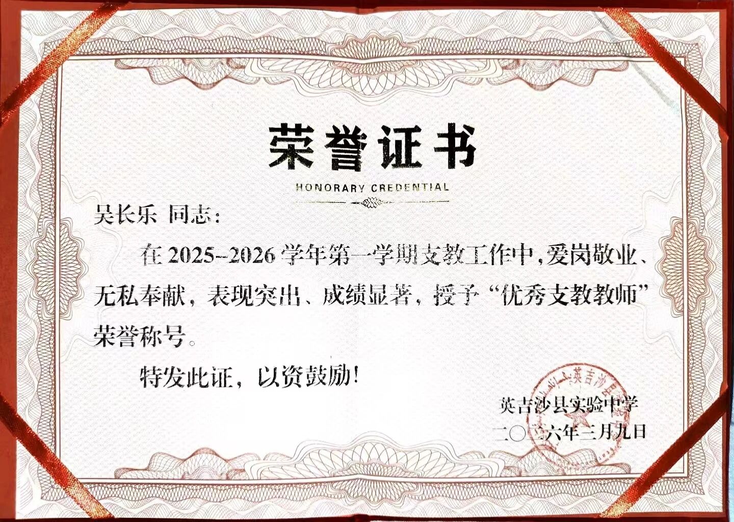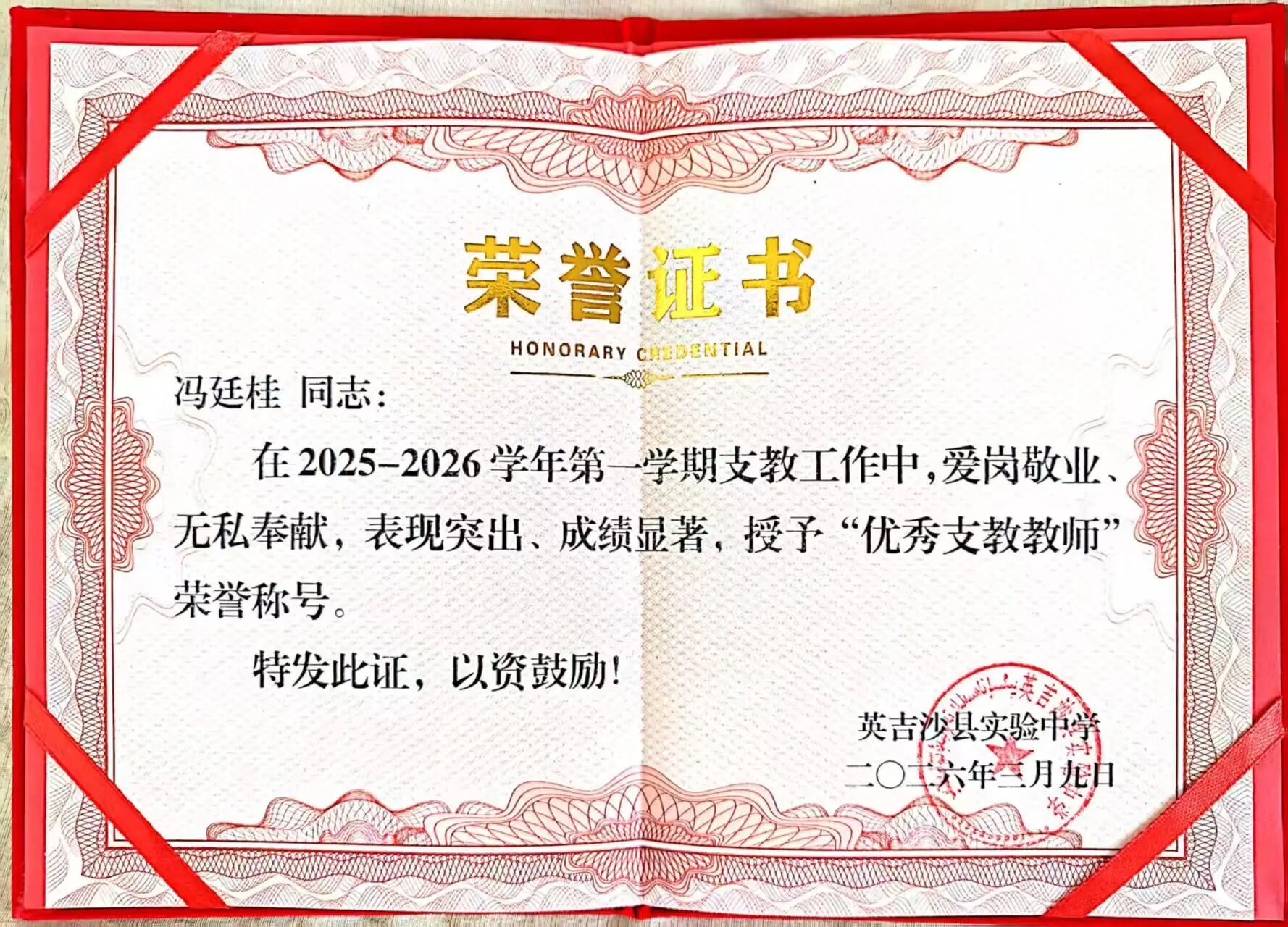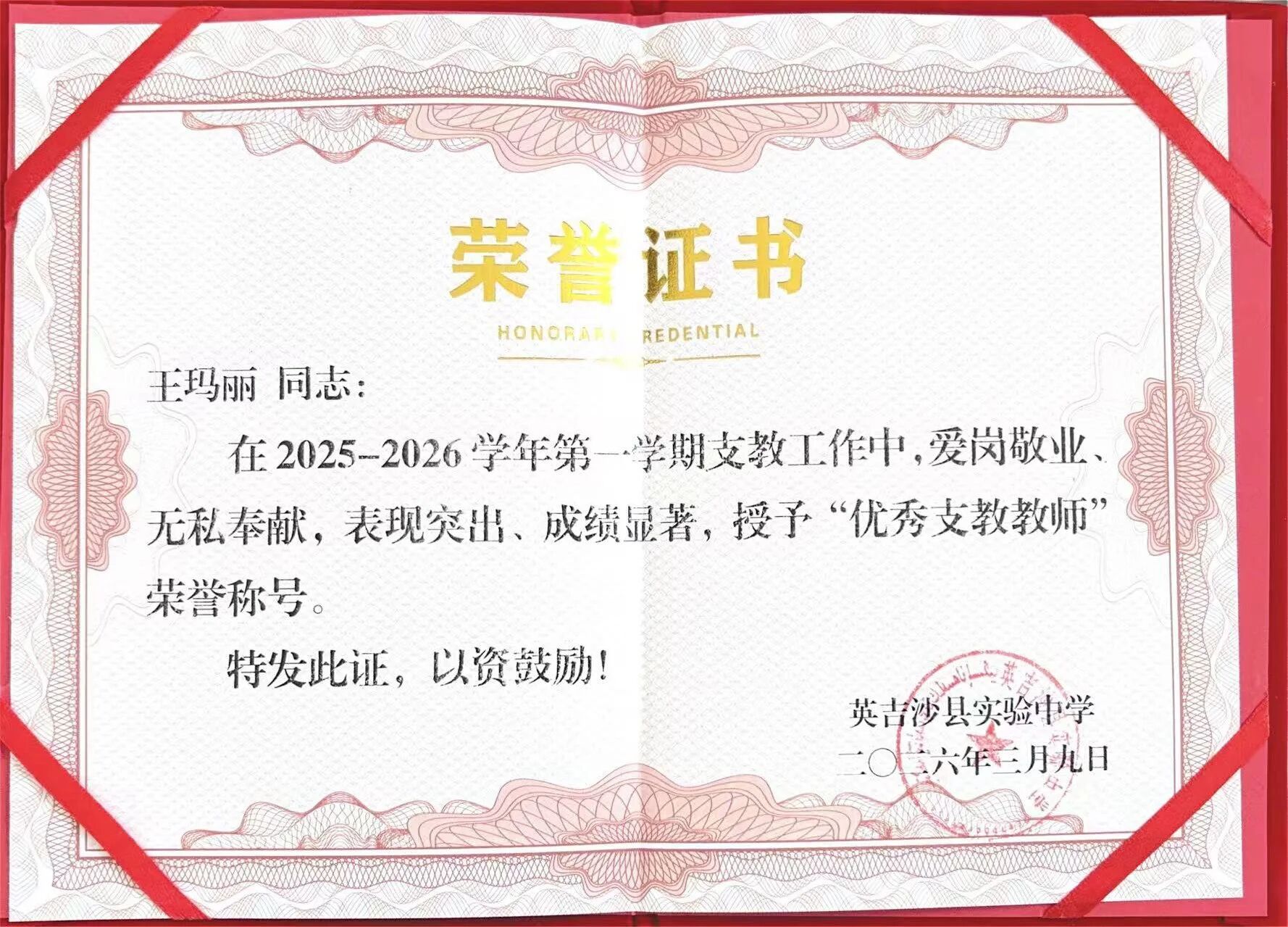 英吉沙服务队9名志愿者凭借在援疆支教期间的突出表现,被所在学校授予“优秀支教教师”荣誉称号。一本本鲜红的荣誉证书,不仅是对志愿者们个人辛勤付出的肯定,更是鲁疆情深的生动写照。半年来,英吉沙服务队的志愿者们克服恶劣气候、远离家乡等诸多困难,迅速融入当地教学环境,主动承担毕业班教学任务,创新教学方法,志愿者所带班级学业成绩均显著提升。他们积极参与“青蓝工程”师徒结对,与当地教师互学共进,利用周末时间开展家访,深入学生家庭了解情况,用真情温暖每一个孩子的心田。“这份荣誉属于我们整个团队,更属于所有关心支持援疆事业的聊大人。”手捧证书,志愿者们纷纷表示,将把这段宝贵的支教经历化为前行的动力,继续在各自岗位上发光发热,为促进民族团结、服务西部教育事业发展贡献青春力量。